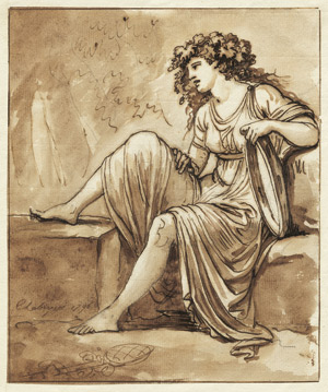 Sitzende Frau in antikischem Gewand mit einem Tamburin.