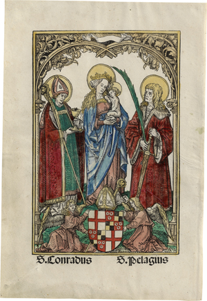 Die Jungfrau mit dem schlafenden Kind und den Heiligen Konrad und Pelagius. Farbholzschnitt von zwei Blöcken, schwarz und rot, alt handkoloriert. 26,3 x 16,1 cm. (1499). Burkhard 78 II, Hollstein 74 II, Elizabeth Savage: Hans Burgmair’s Colour Woodcuts. An overview, In: Hans Burgkmair : Neue Forschungen, Hrsg. Wolfgang Augustyn, Manuel Teget-Welz. 2018, S. 360, Nr. 9, II. Wz. Namen Mariae (Meder (Dürer) S. 319, Nr. 316).