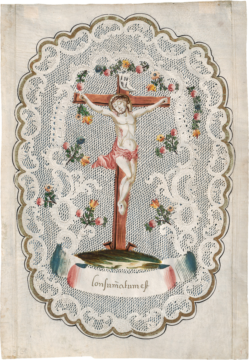 Consummatum est. Niederlande um 1750. Spitzenbillet mit Golderhöhung