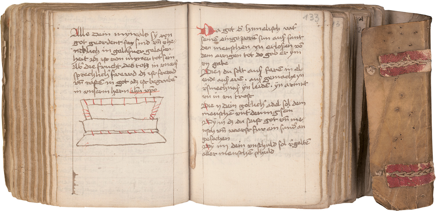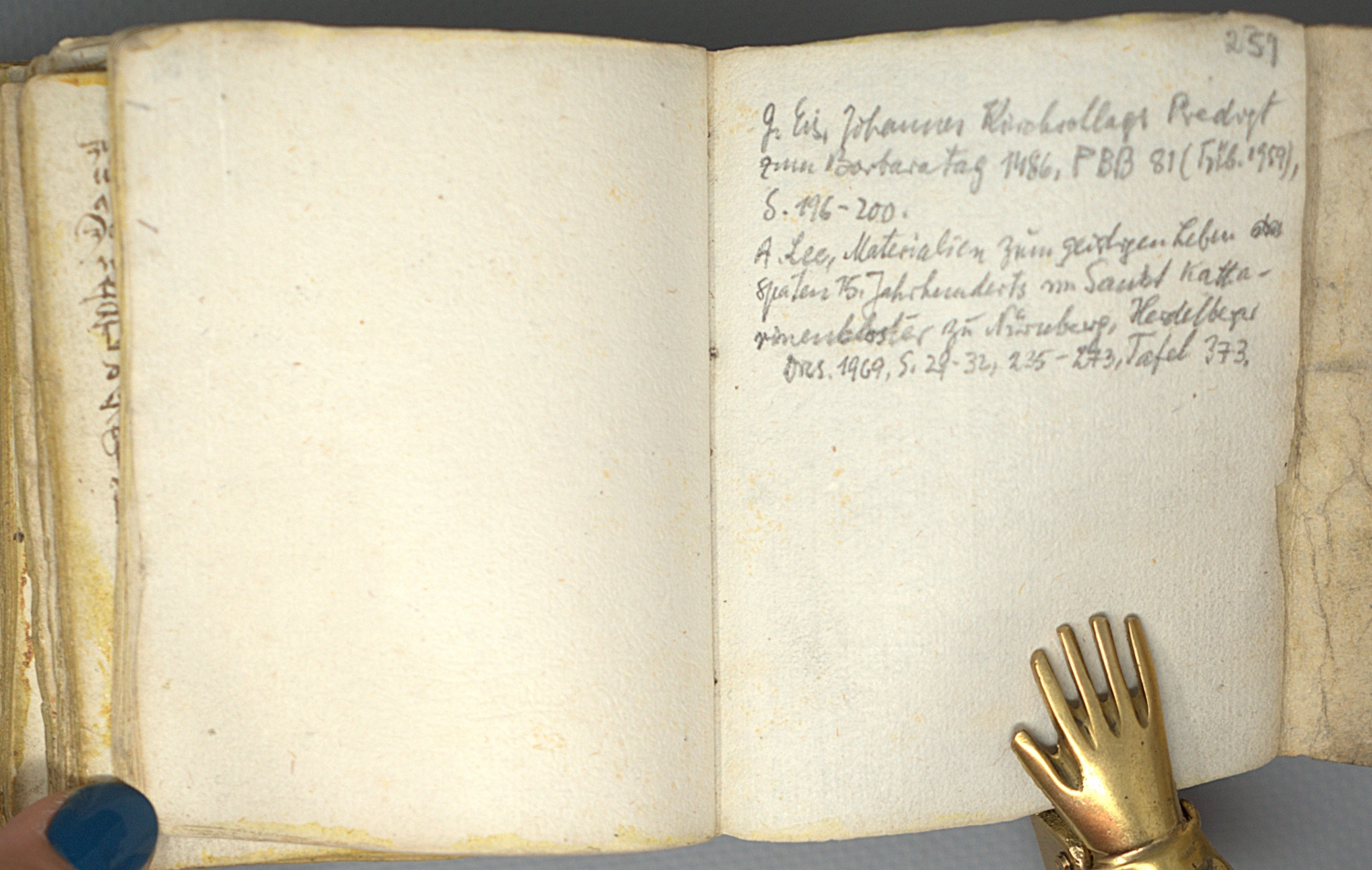 Nürnberger Predigten. Deutsche Handschrift auf Papier. 259 Bl. Verschiedene Hände (Cursiva und Bastarda). Schriftraum: 7,5-8 x 5-5,5 cm. Format 10 x 7,5 cm. Zeilenzahl stark wechselnd. Vereinzelt eingefügte Rubrizierung mit Überschriften, Kapitalstrichelung, aber auch Korrekturen und Ausstreichungen etc. Moderner Kopertband (ohne Bünde und Deckel), unter Verwendung eines festen, wohl alten Pergamentblattes hergestellt. Nünberg, Dominikanerinnenkloster St. Katharina, 1472-1498.