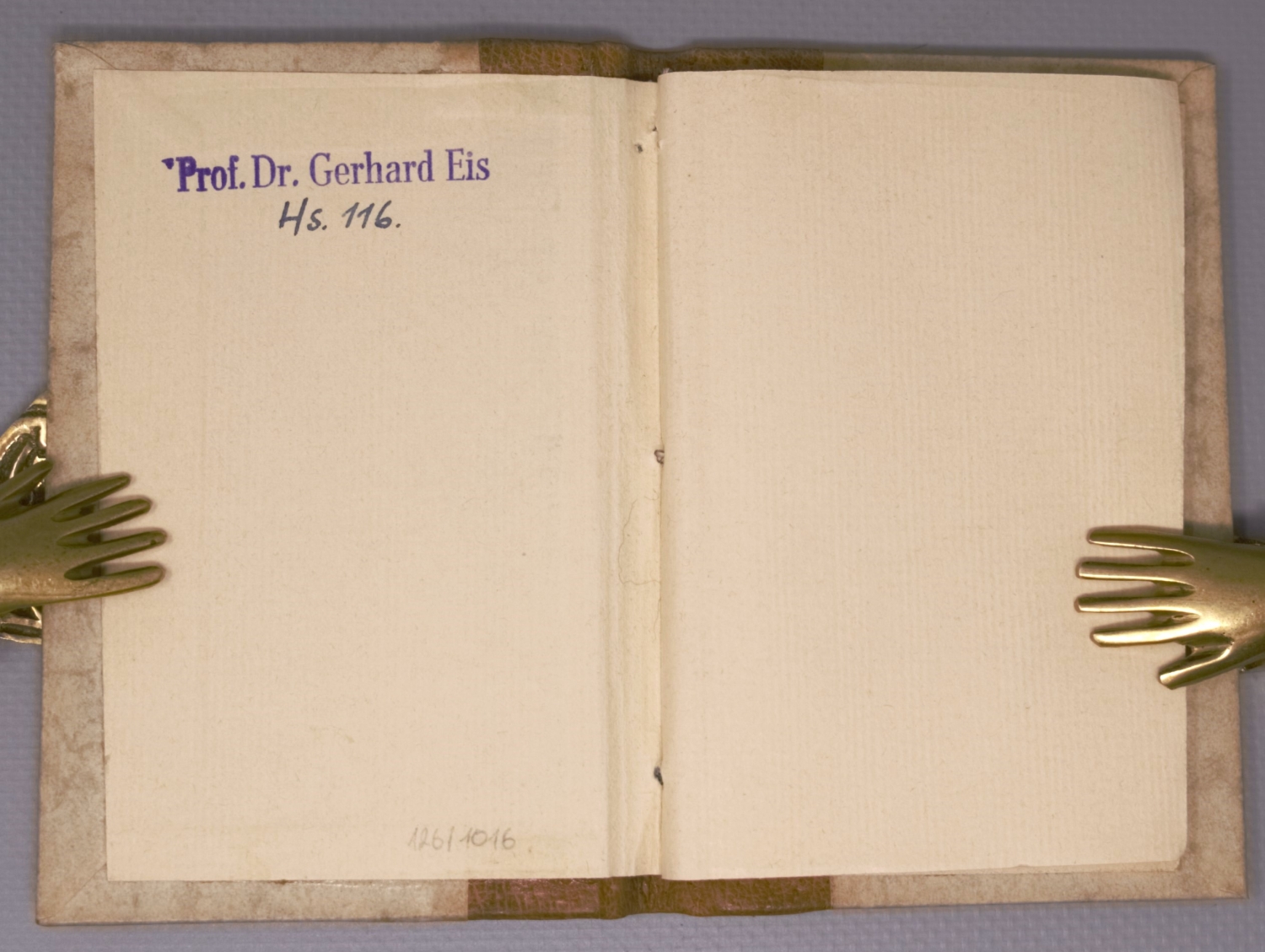 Aus der Sammlung des Germanisten und Mediaevisten Gerhard Eis (1908-1982), hier mit seiner Signatur Hs. 116. Eis erwarb die Handschrift 1959 im Wiener Antiquariat Heinrich Hinterberger. Bibliographische Notizen seiner Hand auf dem Schutzblatt hinten.
