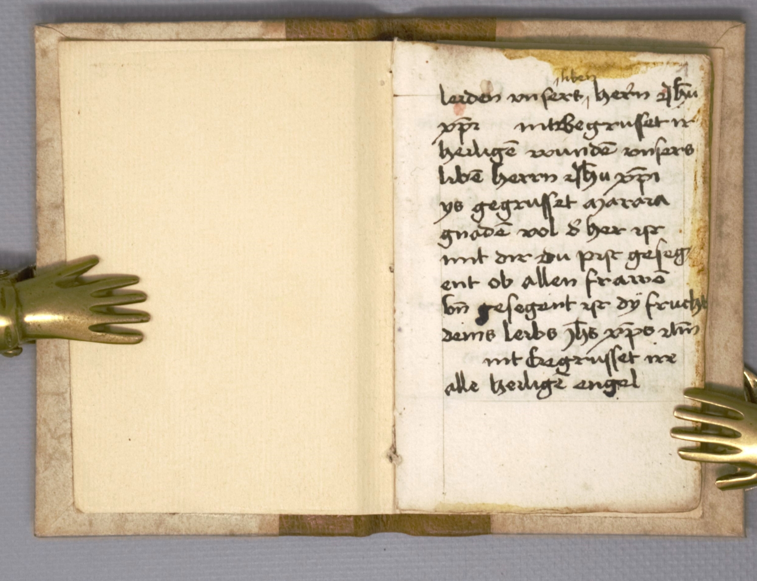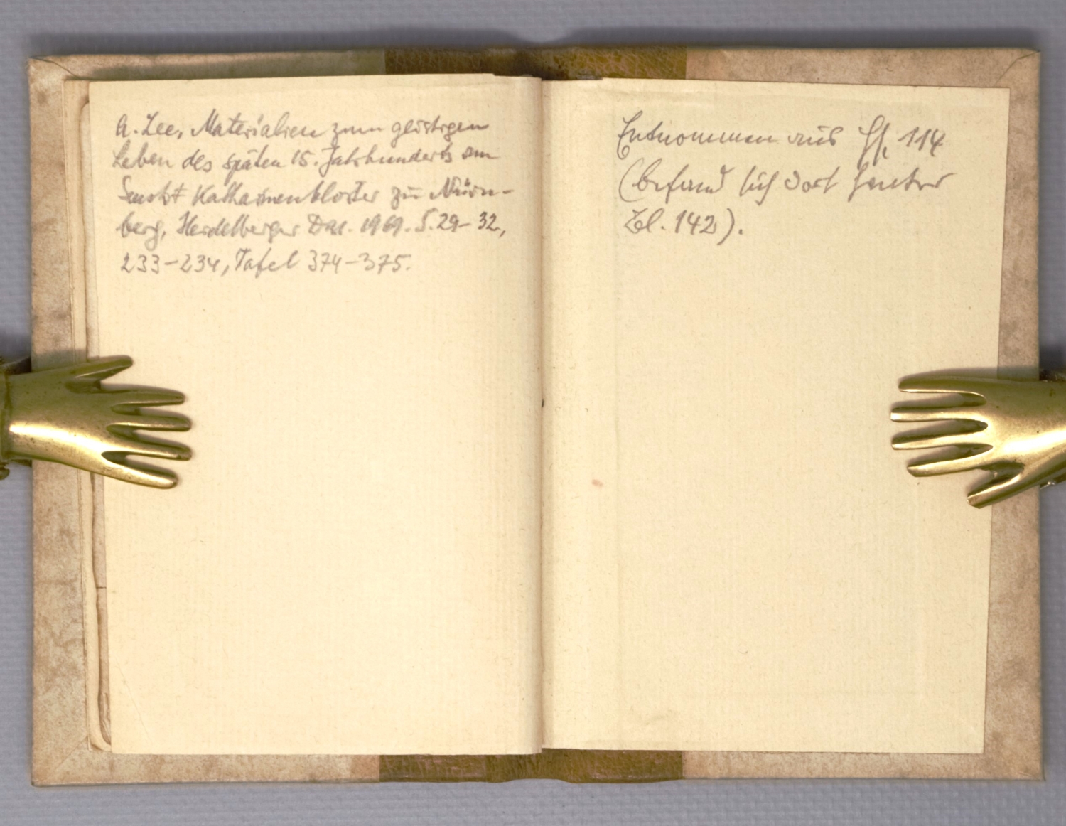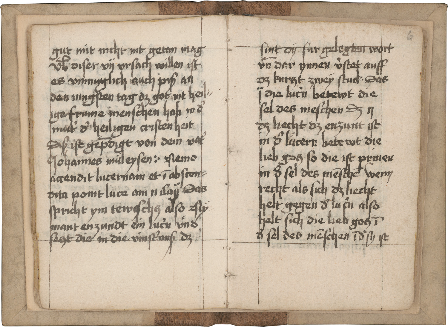 Muleysen, Johannes, Friedrich Stromer und Johannes Diemar. Nürnberger Predigten, Fragment einer Handschrift aus dem Dominikanerinnenkloster St. Katharina in Nürnberg, entnommen aus Hs. 114 der Sammlung Gerhard Eis. Das Fragment befand sich dort hinter Bl. 142. Deutsche Handschrift auf Papier, 22 Bl. Bastarda von mehreren Händen (Nürnberger Dominikanerinnen). Schriftraum und Zeilenzahl wechselnd. Format: 10 x 7 cm. Gut erhalten. Modernes Halbleder. Nürnberg, Dominikanerkloster St. Katharina, 1478-1492.