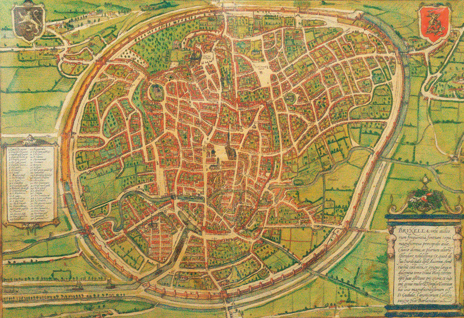 Braun, Georg, und Franz Hogenberg. Bruxella. Kolorierter Kupferstich. 33 x 47,5 cm (Plattenrand). Unter Glas mit Passepartout in goldgeprägter Holzprofilleiste. Köln um 1580.