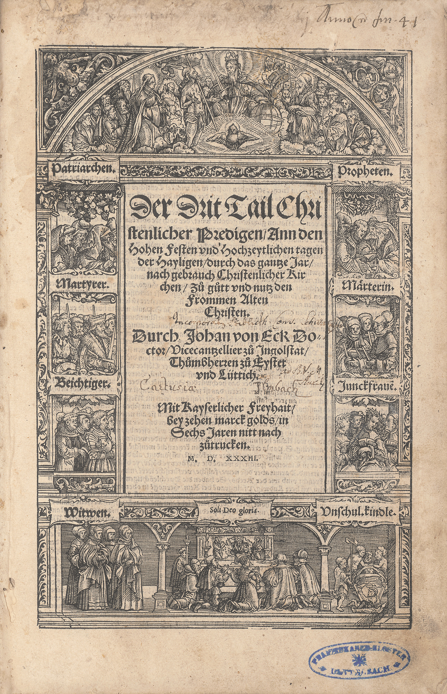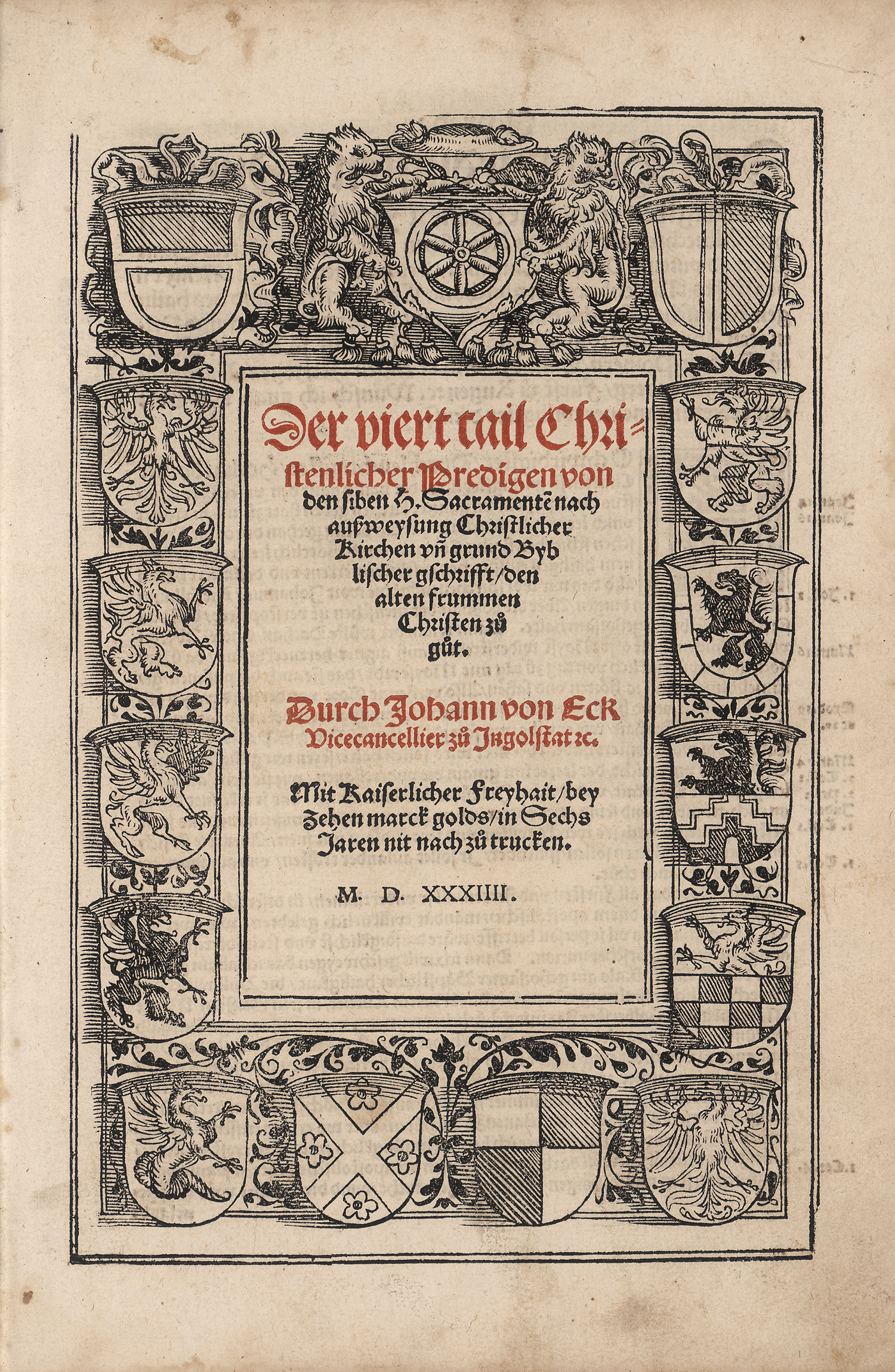 VD16 E 288. STC 452. Adams E 31. Dodgson II, S. 426, Nr. 12f. (2). Metzler 68 IV. Nicht bei Muther. – Fünfte Augsburger Ausgabe bei Weißenhorn, die erste wurde dort 1531 gedruckt (VD16 E 283). Die erste Ausgabe war 1530 von Peter und Georg Apian in Ingoldstadt gedruckt worden. Das Werk ist ein Teil einer großangelegten, zwischen 1530 und 1539 erschienenen Predigtreihe, durch die Johannes Eck im Kampf gegen den Protestantismus die Verkündigung des Wortes Gottes in der katholischen Kirche stärken wollte. Die zweiteilige "Christenliche außlegung der Euangelienn" hatte den Anfang gemacht und war in Ingolstadt gedruckt worden, der vorliegende Band mit den "Predigen von den siben H. Sacramenten" erschien bei Alexander Weißenhorn, dem "einzigen Drucker in Augsburg, der während der Reformation bei der römischen Kirche blieb", und der von den Aufträgen "seiner beiden Hauptautoren Johann Eck und Johann Cochläus" (Künast 1221) lebte. Der Druck erschien entsprechend "in verlegung D. Johan. Ecken zu Ingelstat", wie das Kolophon vermerkt. Im Sommer 1539 folgte der Drucker selbst "dem Ruf der Universität und Johann Ecks nach Ingolstadt, wo sich die Weißenhorn-Offizin ganz in den Dienst der katholischen Reform und Gegenreformation stellte" (Künast 1221). – Vorsatz mit hs. Notizen und Titel mit unleserlichem Bibliotheksstempel und hs. Besitzvermerk. Etwas braun- und fingerfleckig, etwas feuchtrandig und mit hs. Notizen am Rand.