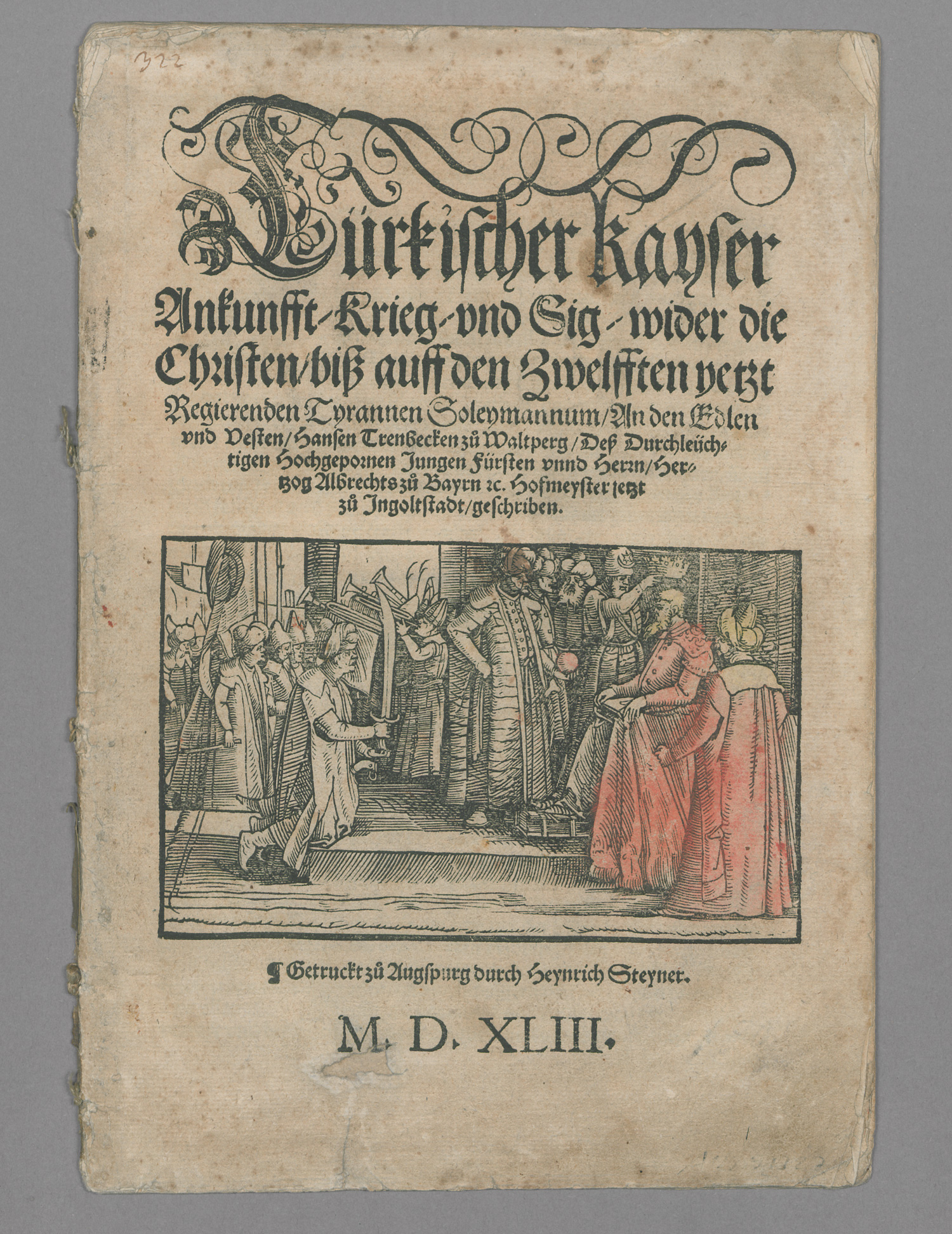 (Traut, Veit). Ankunfft-Krieg- und Sig-wider die Christen biß auff den Zwelfften yetzt Regierenden Tyrannen Soleymannum. An den Edlen und Vesten Hansen Trenbecken zu Waltberg. 20 (von 23) num. Bl. Mit großer Holzschnittvignette auf dem Titel und 13 (von 14; 8 ankoloriert) Textholzschnitten. Fadenheftung, ungebunden. Augsburg, Heinrich Steiner, 1543.
