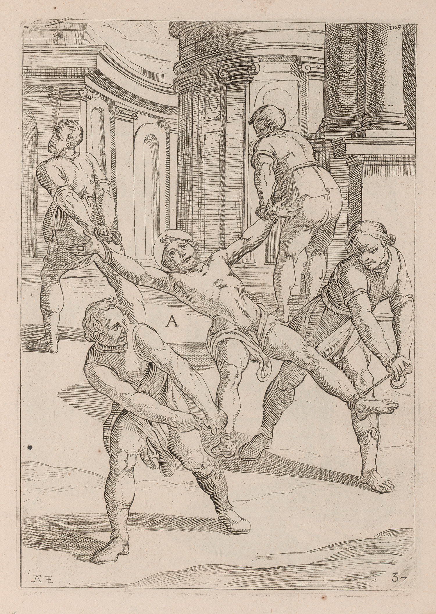 Der letzte Teil stellt allerlei grausame und martyrische Foltermethoden dar nach dem erstmal 1594 in Rom erschienen Werk von dem Priester der Kongregation des Oratoriums von Italien Antonio Gallonio (1556-1605). Die Tafeln zeigen Folterszenen, denen die Märtyrer der Urkirche ausgesetzt waren wie zum Beispiel Kreuzigung, Aufhängung, Auspeitschung, Verbrennung, Enthauptung usw. – Etwas finger- und braunfleckig, sonst sehr schönes und gut erhaltenes Exemplar. Mit teils gratigen und beeindruckenden Stichen.