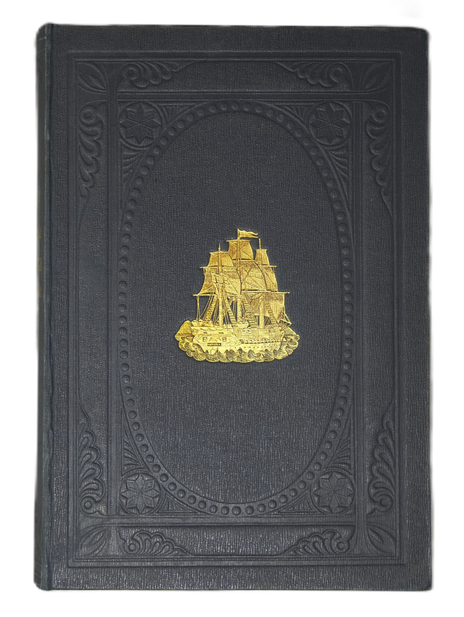 (Scherzer, Karl von). Reise der Oesterreichischen Fregatte Novara um die Erde, in den Jahren 1857, 1858, 1859, unter den Befehlen des Commodore B. von Wüllerstorf-Urbair. 3 Bände. Mit getöntem Holzschnitt-Frontispiz, 5 gefalteten Musikbeilagen, 39 (1 gefaltete) getönte Holzstich-Tafel, 7 (5 gefaltete) lithographierte Tafeln, 30 gefaltete getönte lithographierte Tafeln und zahlreiche Textholzschnitte. 25,3 x 17 cm. Reich blindgeprägte, dunkelgrüne OLeinenbände (kaum bestoßen, kleine Fehlstelle am Gelenk von Band I) mit goldgeprägtem RTitel und großer goldgeprägter VDeckelvignette (Segelfregatte). Wien, Hof- und Staatsdruckerei für Gerold, 1861-1862.