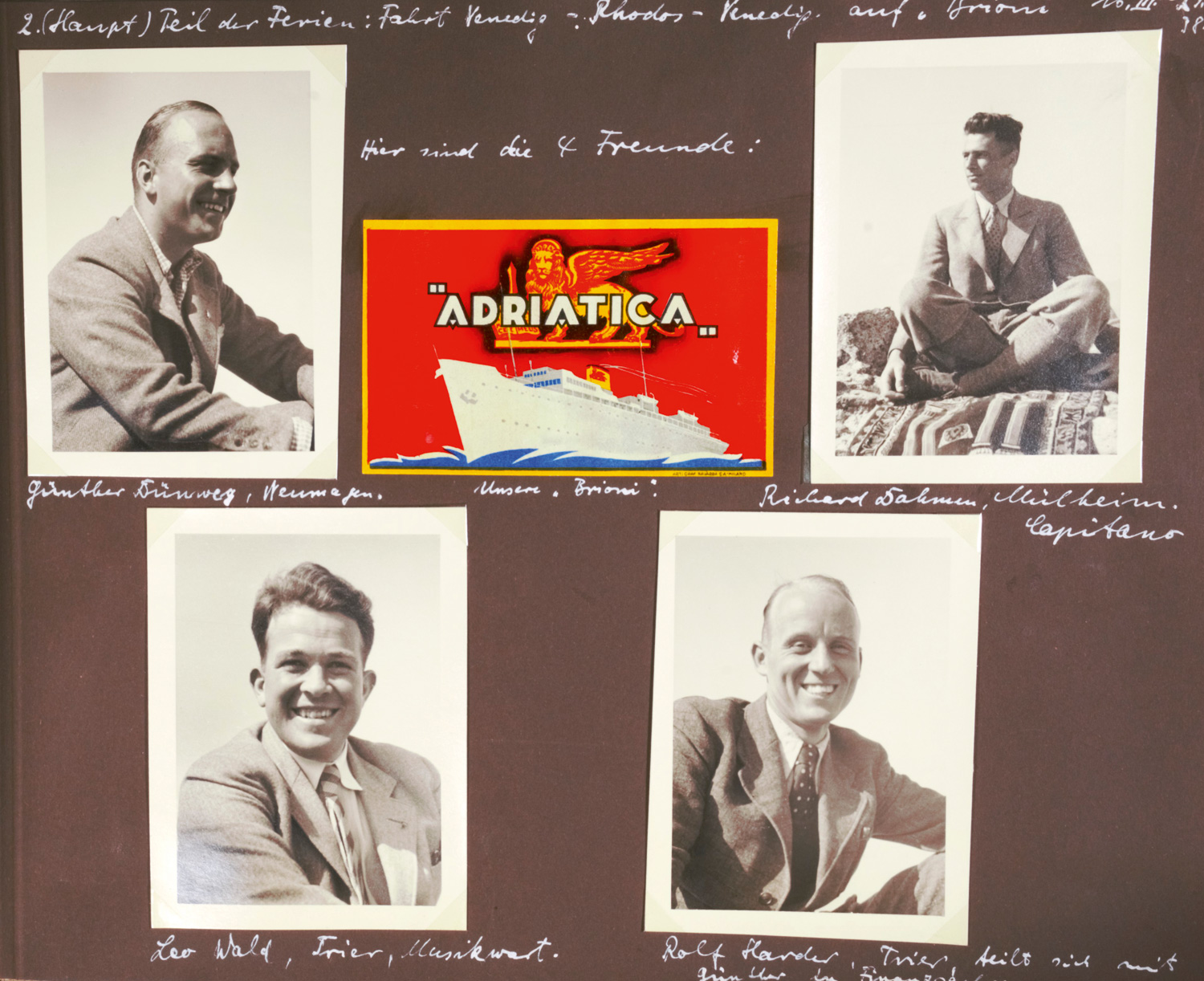 Privates Fotoalbum mit annährend 300 Fotos. Sie schildern eine Reise von vier befreundeten jungen Männern, die vom 4. März bis 1. April 1938 andauerte. Die Vier bereisten die Alpen, wanderten und trieben Wintersport im Ortlergebiet in Südtirol, besuchten Meran und bestiegen in Venedig das Schiff Brioni, das sie nach Triest, Koper, Split und Tirana bis Korfu brachte, unterbrochen von Landausflügen, etwa zu den Adelsberger Grotten. Höhepunkt der Reise war der Besuch von Athen. Weiter ging es nach Smyrna, Patmos, Rhodos, zurück nach Venedig und mit der Bahn über Bozen in "die Heimat - Großdeutschland - [wo es] doch am schönsten [ist] München, Haus der Kunst" (so der Eintrag unter dem letzten Foto). Alle Fotos sind erläutert, genannt sind die Orte, vereinzelt auch die Reiseumstände, Tageszeiten etc. sowie die Namen der gezeigten vier Freunde: Günther Dünweg aus Neumagen, Richard Dahmen aus Mülheim ("Capitano"), Leo Wald, Trier ("Musikwart") und Rolf Harder, Trier ("teilt sich mit Günther in Finanzsachen"). Die Kommentare sind glücklicherweise nicht im aufdringlich spaßigen Stil gehalten, wie es bei Alben dieser Art oft der Fall ist. Einige Fotos zeigen Günthers fotografisches Talent, dem es immer wieder gelingt, nicht nur Schnappschüsse, sondern atmosphärisch dichte Aufnahmen zu produzieren. Die Fotos zeigen das, was man in einem Album dieser Art erwartet: Straßenszenen, Gebäude, Landschaftsaufnahmen, Land und Leute, das Leben an Bord, die antiken Monumente etc. Einige Kommentare sind im Herrenmenschen-Ton gehalten, z. B. "Hauptbeschäftigung der Männer in Tirana: Im Straßendreck herumlungern." Allein über einen einzigen Teilnehmer der Reise, über Günther Dünweg, kann man auf der Website der Gesellschaft für Geschichte des Weines (https://www.geschichte-des-weines.de) Folgendes erfahren: "Weingutsbesitzer und Weinkommissionär. *6. Mai 1912 in Neumagen, † 9. April 1989 ebd. - Entstammt einer alteingesessenen Weingutsfamilie. Weinbaustudium in Geisenheim. Danach Übernahme des elterlichen Weingutes, Weinhandels- und Weinkommissions-Unternehmens. Gründungsmitglied der Weinbruderschaft Mosel-Saar-Ruwer und von 1970−88 deren Bruderschaftsmeister, danach bis zu seinem Tode Ehrenbruderschaftsmeister. 38 Jahre Mitglied des Kreistages Bernkastel und Bernkastel-Wittlich und fast ebensolange Mitglied des Kreisausschusses und des Weinbauausschusses. 1946−84 führte er die Kreistagsfraktion der FDP. Im Heimatort Neumagen war er 1947−80 Vorsitzender des Sportvereins. 1986 Ernennung zum Ökonomierat und Auszeichnung mit dem Bundesverdienstkreuz, der Freiherr-vom-Stein-Plakette und der Theodor-Heuss-Medaille. Er hat sich um den Weinbau von Mosel-Saar-Ruwer sehr verdient gemacht, wobei er besonders die weinrechtlichen Entwicklungen mitgestaltet hat. Dabei ist er für die Rebsorte Riesling und ihre weinrechtliche Stellung, Bezeichnung und Spezialität in besonderem Maße eingetreten. Aber auch der Erhalt und die Förderung der Familienbetriebe im Weinbaugebiet und damit die Zukunft der Weinlandschaft waren ihm ein großes Anliegen." Das Album bekommt auch durch die Tatsache, dass eineinhalb Jahre später wohl alle vier Reiseburschen in welcher Funktion auch immer in Hitlers Malstrom des Todes gerieten, eine besondere Wirkung. - Die beiden gekreuzt montierten Stoffbänder auf dem Vorderdeckel tragen die Aufschriften "Marco Polo" und "Filippo Rimani". – Sehr gut erhalten.