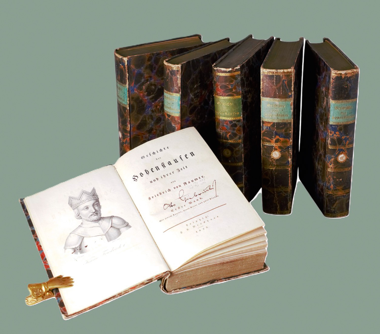 Raumer, Friedrich von. Geschichte der Hohenstaufen und ihrer Zeit. 6 Bände. Mit 8 Kupfertafeln, 3 gefalteten gestochenen Plänen und 2 kolorierten gefalteten Kupferstichkarten. 20,5 x 12,5 cm. Marmorierte Pappbände d. Z. (berieben und bestoßen) mit RVergoldung und goldgeprägten RSchildern. Leipzig, Brockhaus, 1823-1825.