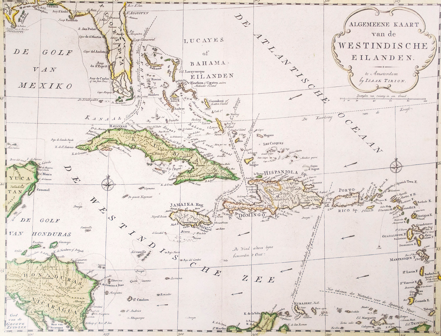 Tirion, Isaac. Algemeene Kaart van de westindische Filanden. Grenz- und flächenkolorierte Kupferstichkarte. 35,5 x 45,5 cm (Plattenrand). Unter Glas mit Passepartout in goldgeprägter Holzprofilleiste. Amsterdam 1753.