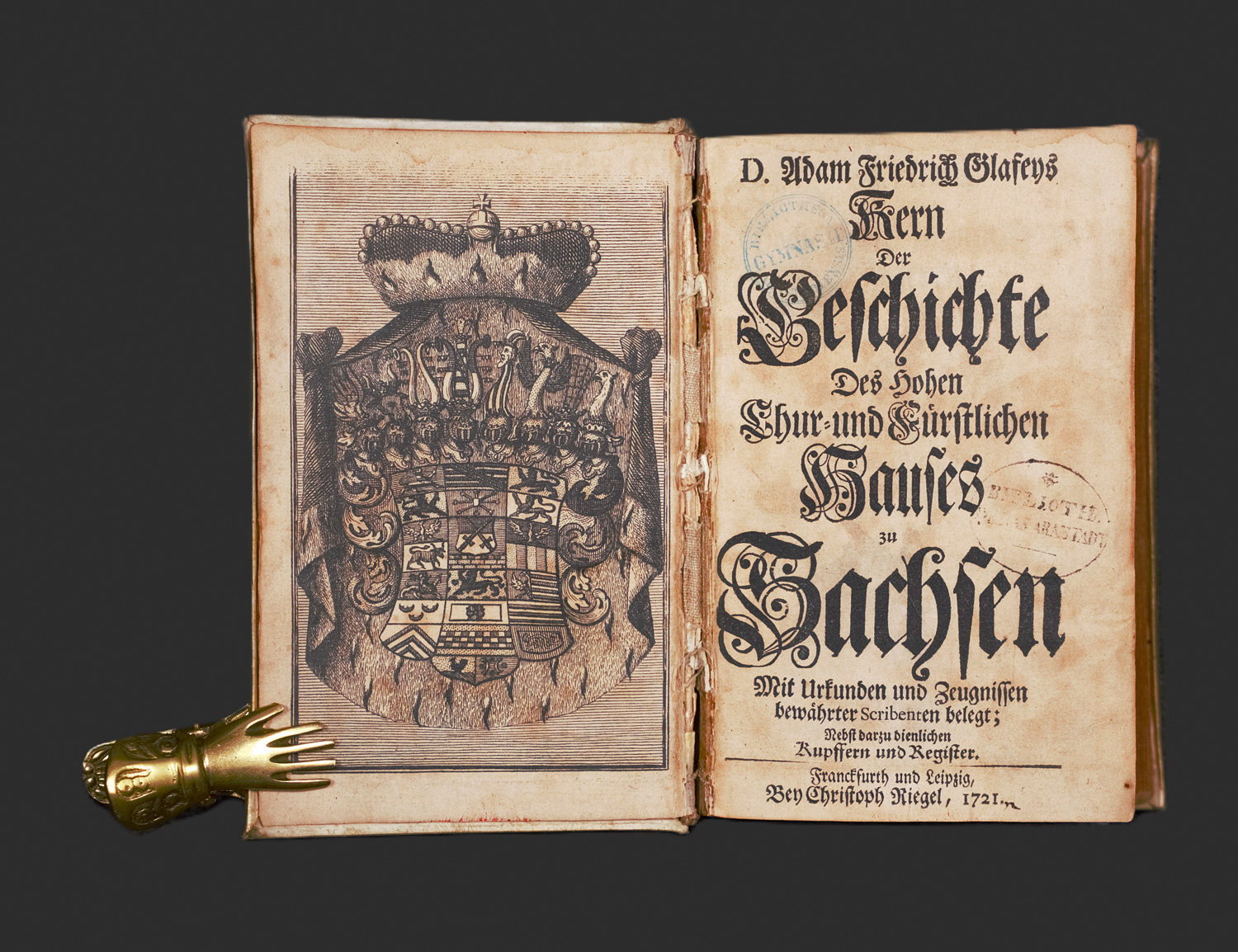 Glafey, Adam Friedrich. Kern der Geschichte des Hohen Chur- und Fürstlichen Hauses zu Sachsen. Mit Urkunden und Zeugnissen bewährter Scribenten belegt. 5 Bl., 1264 S., 15 Bl. Mit gestochenem Frontispiz und 17 gestochenen Portraits. 16 x 10 cm. Pergament d. Z. mit hs. RTitel. Frankfurt und Leipzig, Christoph Riegel, 1721.