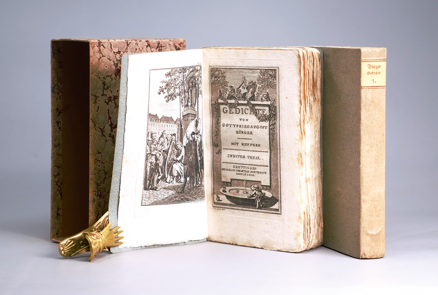 Bürger, Gottfried August. Gedichte. 2 Bände. 46, 272 S.; 10, 296 S. Mit 2 gestochenen Titeln, gestochenem Portrait, 10 Kupfertafeln (2 nach Meil und 8 nach Chodowiecki) von Riepenhausen sowie 4 gestochenen Textvignetten von Meil und Schellenberg. 16,5 x 10 cm. Spätere Broschur mit RSchild in marmoriertem Pappschuber. Göttingen, Johann Christian Dieterich, 1789.