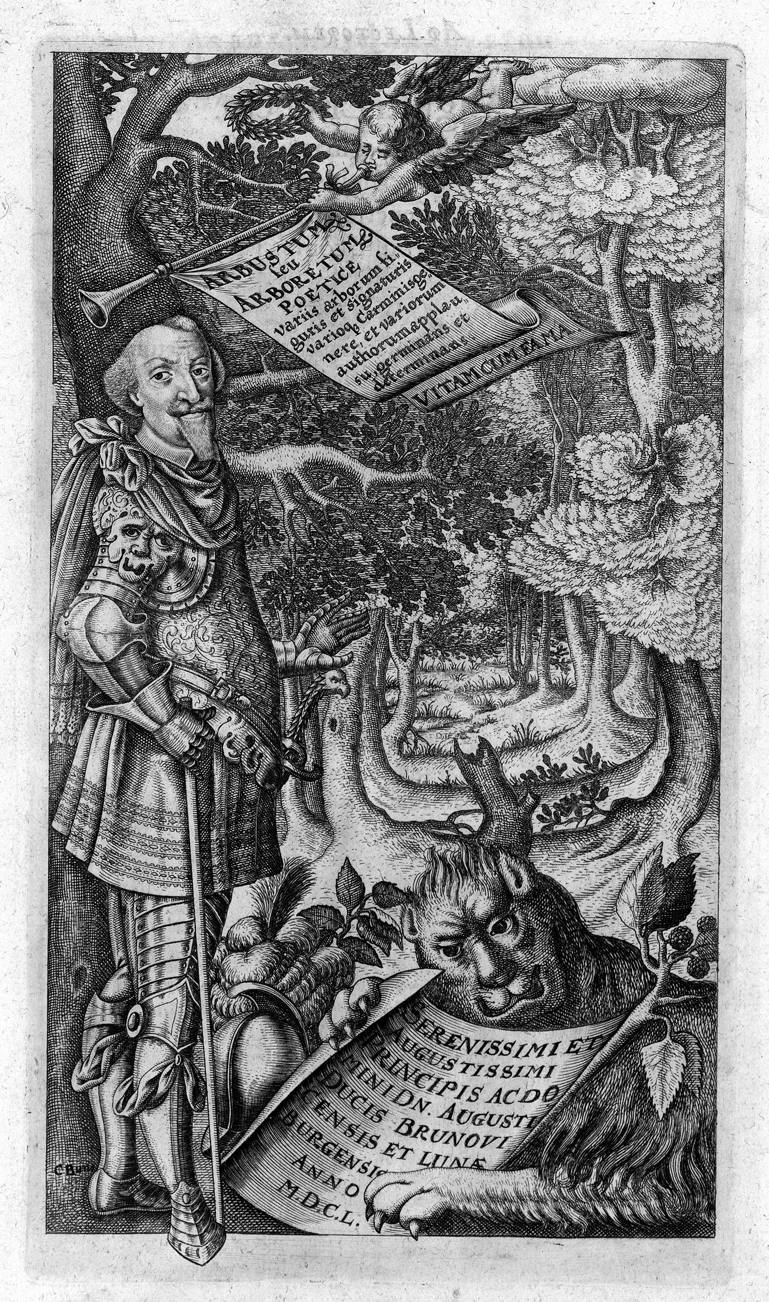 Gosky, Martin. Arbustum vel arboretum Augustaeum, aeternitati ac domui Augustae Selenianae sacrum, satum autem & educatum. 71 nn. Bl., 585 (recte 597) num. Bl. Mit gestochenem Frontispiz, 42 (27 ganzseitigen) und 5 doppelblattgroßen bzw. gefalteten Kupfertafeln von Conrad Buno und Sebastian Furck. 30 x 18 cm. Leder d. Z. (berieben, Beschabungen und Läsuren) mit Deckelblindprägung. Wolfenbüttel, Johan und Heinrich Stern, 1650.