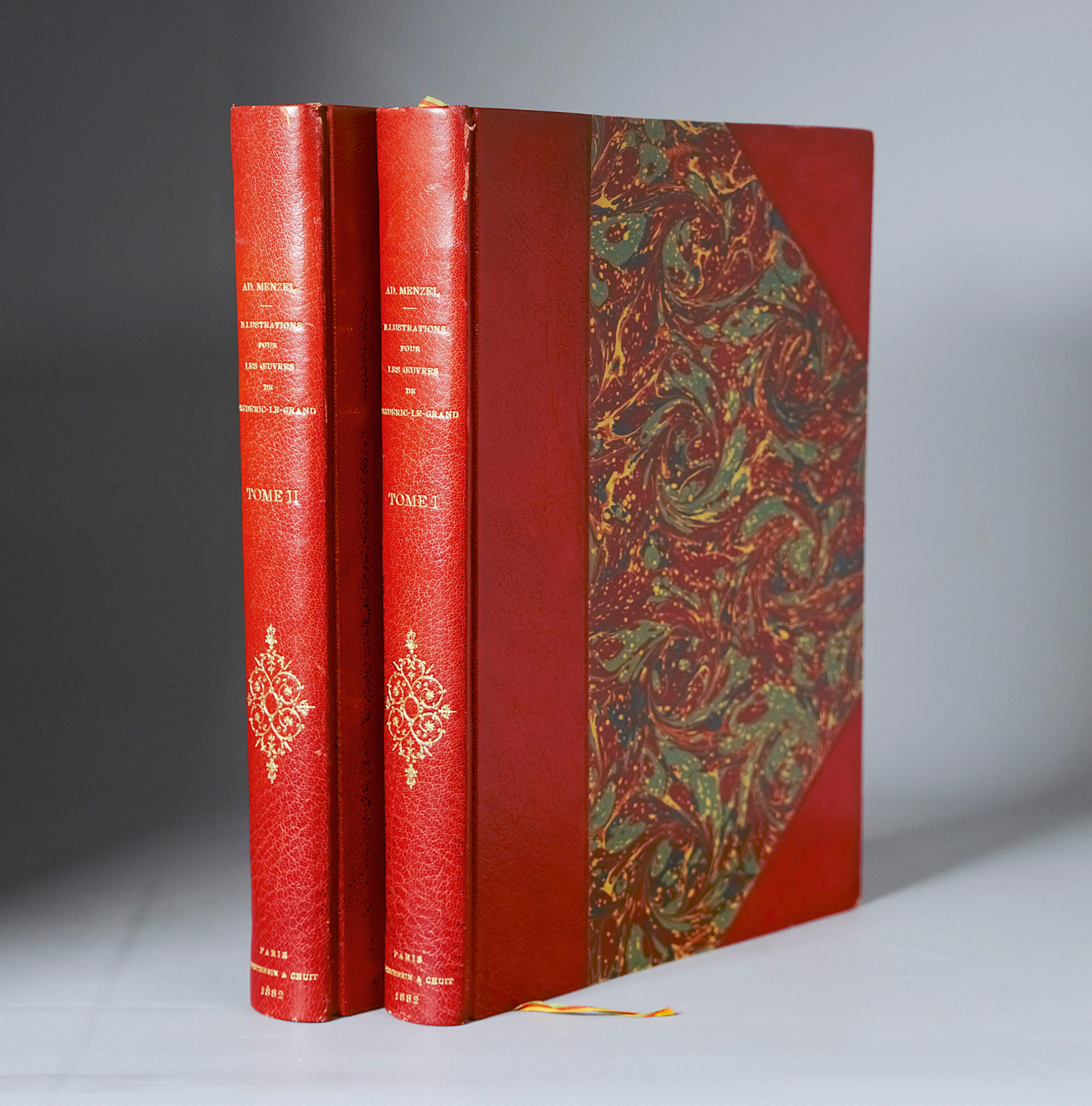 Menzel, Adolph von. Illustrations pour les oeuvres de Frédéric le Grand. Bde I und II (von 4). 52 S., 2 Bl.; 58 S., 1 Bl. Mit zusammen 199 Tafeln und einigen Vignetten. 32,5 x 23,5 cm. Rote Halbmaroquinbände d. Z. mit RVergoldung und KGoldschnitt; OBroschurumschläge eingebunden. Paris und Berlin, Fetscherin et Chuit bzw. R. Wagner, (1882).