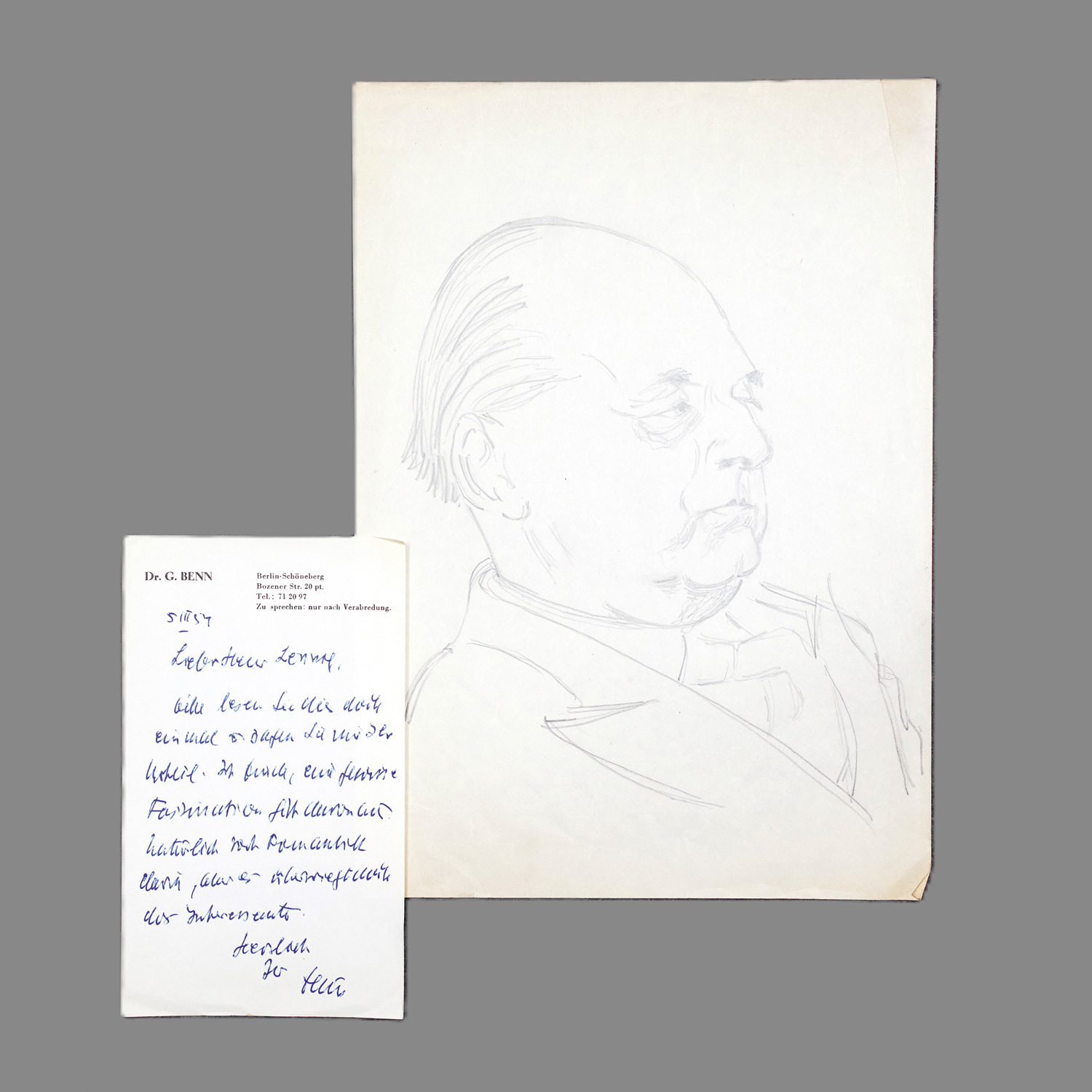 An Walter Lennig. "... bitte lesen Sie dies doch einmal u. sagen Sie mir Ihr Urteil. Ich finde, eine gewisse Faszination geht davon aus. Natürlich noch Romantik darin, aber es überwiegt doch das Interessante ...". - Beiliegend eine große Orig.-Bleistiftzeichnung von Rita Zeltner mit dem Porträt Gottfrieds Benns; der Kopf halb nach rechts gewendet (29,5 x 20,7 cm)..