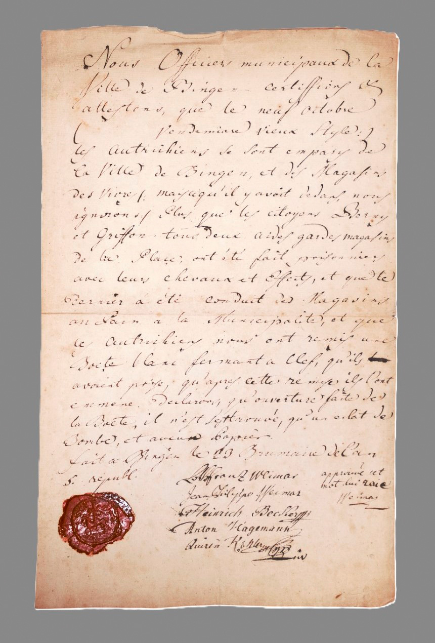 Bingen am Rhein. Kriegsbericht von 5 städtischen Beamten. In franz. Sprache. Mit dem Bingener Stadtsiegel in rotem Lack. 1 S. Doppelbl. Folio. Bingen "23 Brumaire de l'an 5 republ." (14.XI.1796).