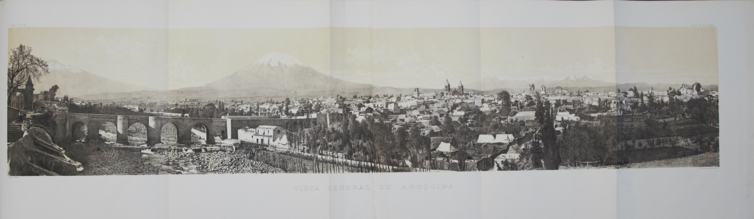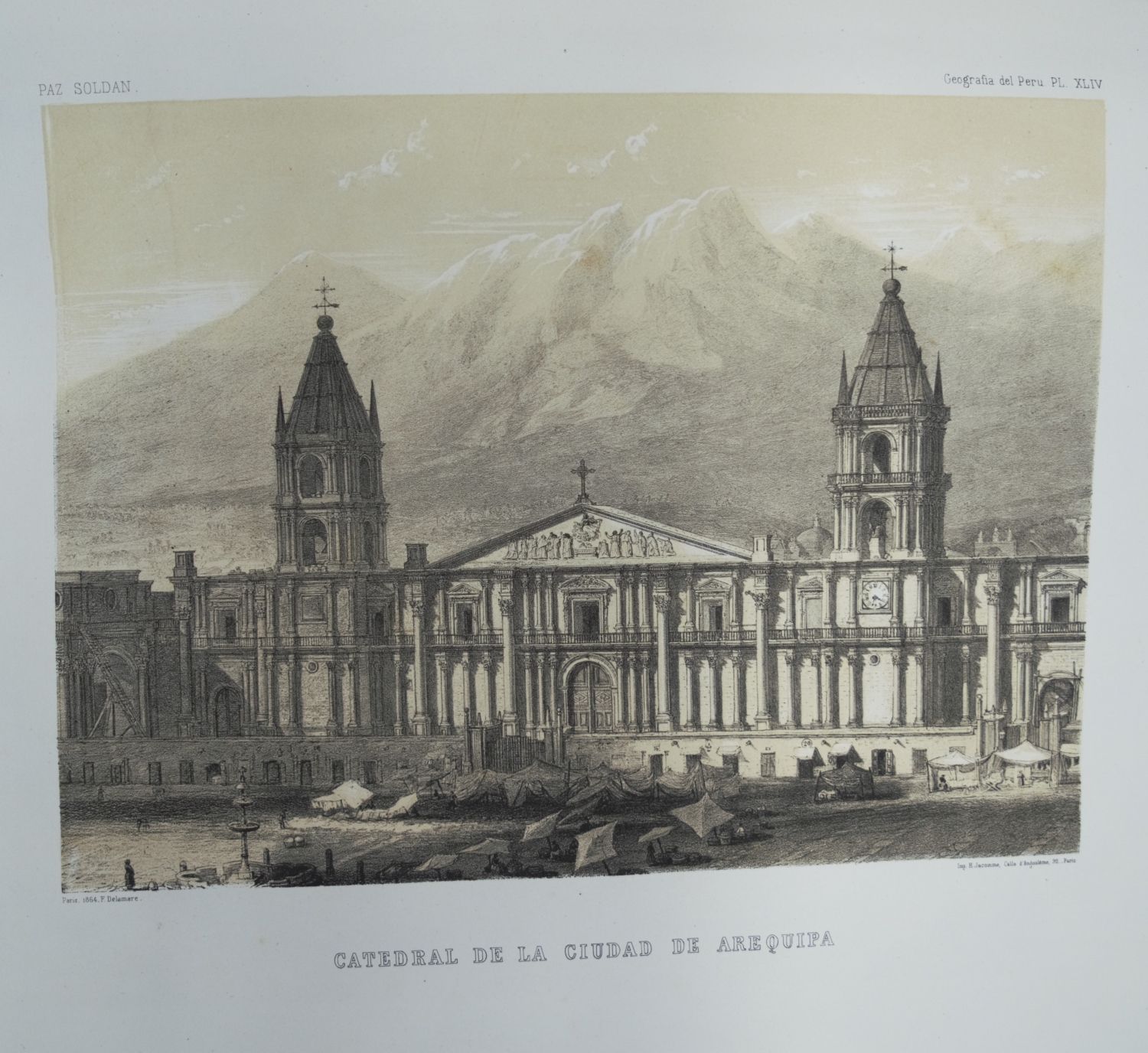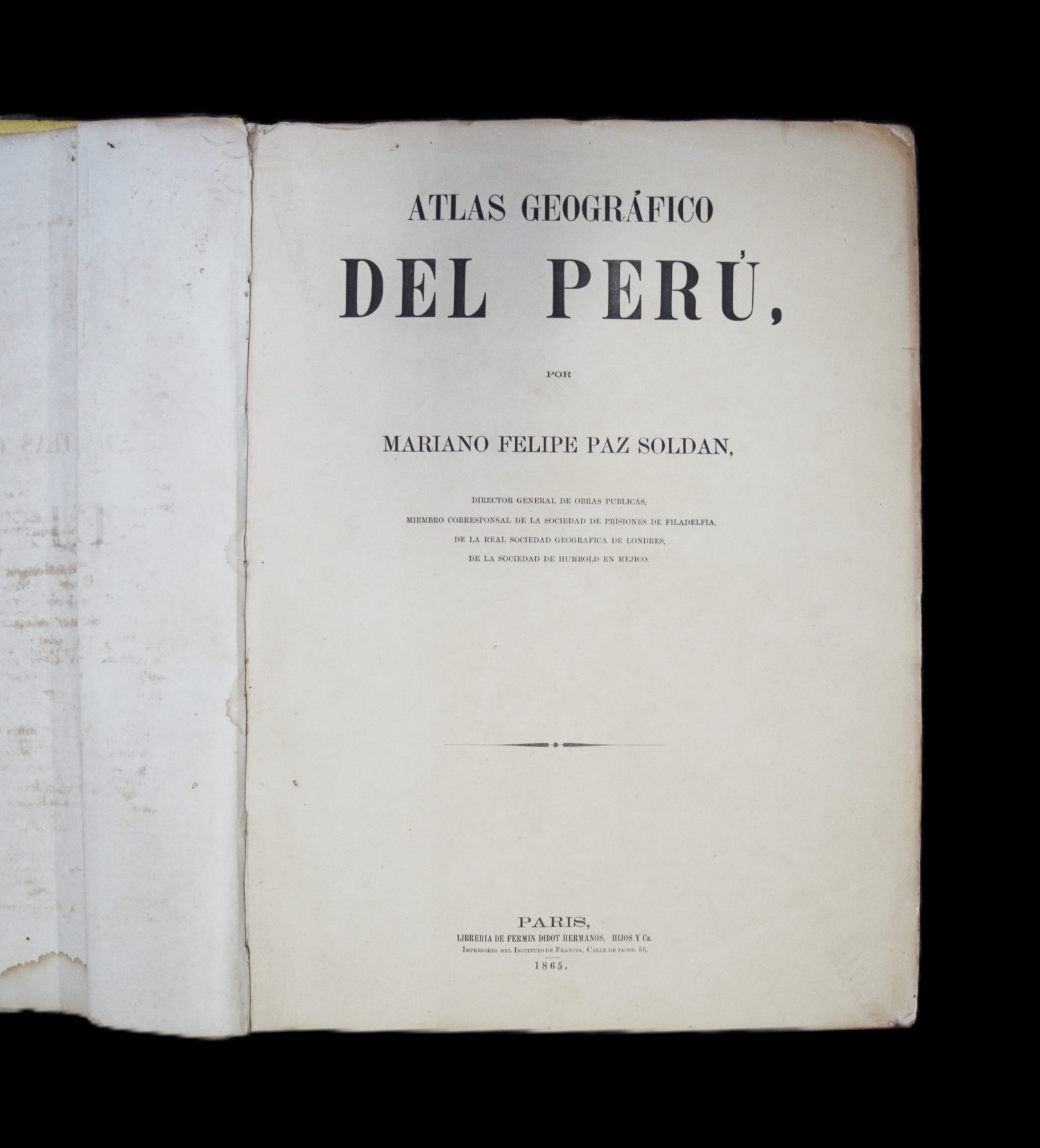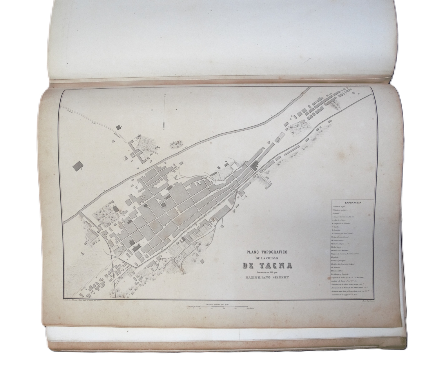 Phillips I, 2769 (73 Tafeln). Palau VI, 54 (68 Tafeln). Sabin I, 59325 (67 Tafeln). – Ein Atlas über Peru von dem peruanischen Historiker und Geograf Mariano Felipe Paz Soldan (1821-1886). Die zahlreichen Tafeln zeigen Ansichten des Landes, Landkarten, Stadtpläne und Alltagsszenen. – Zusätzlich Tafel XXIXbis vorhanden, diese nicht bei Phillips angegeben. Einige der Titel auf den Tafeln mit leichten Abweichungen zu den von Phillips angegebenen oder anderer Nummerierung. Vortitel stärker fleckig, mit Einrissen und Randläsuren. Papierbedingt gebräunt, etwas stock- und braunfleckig sowie mit Knickspuren.