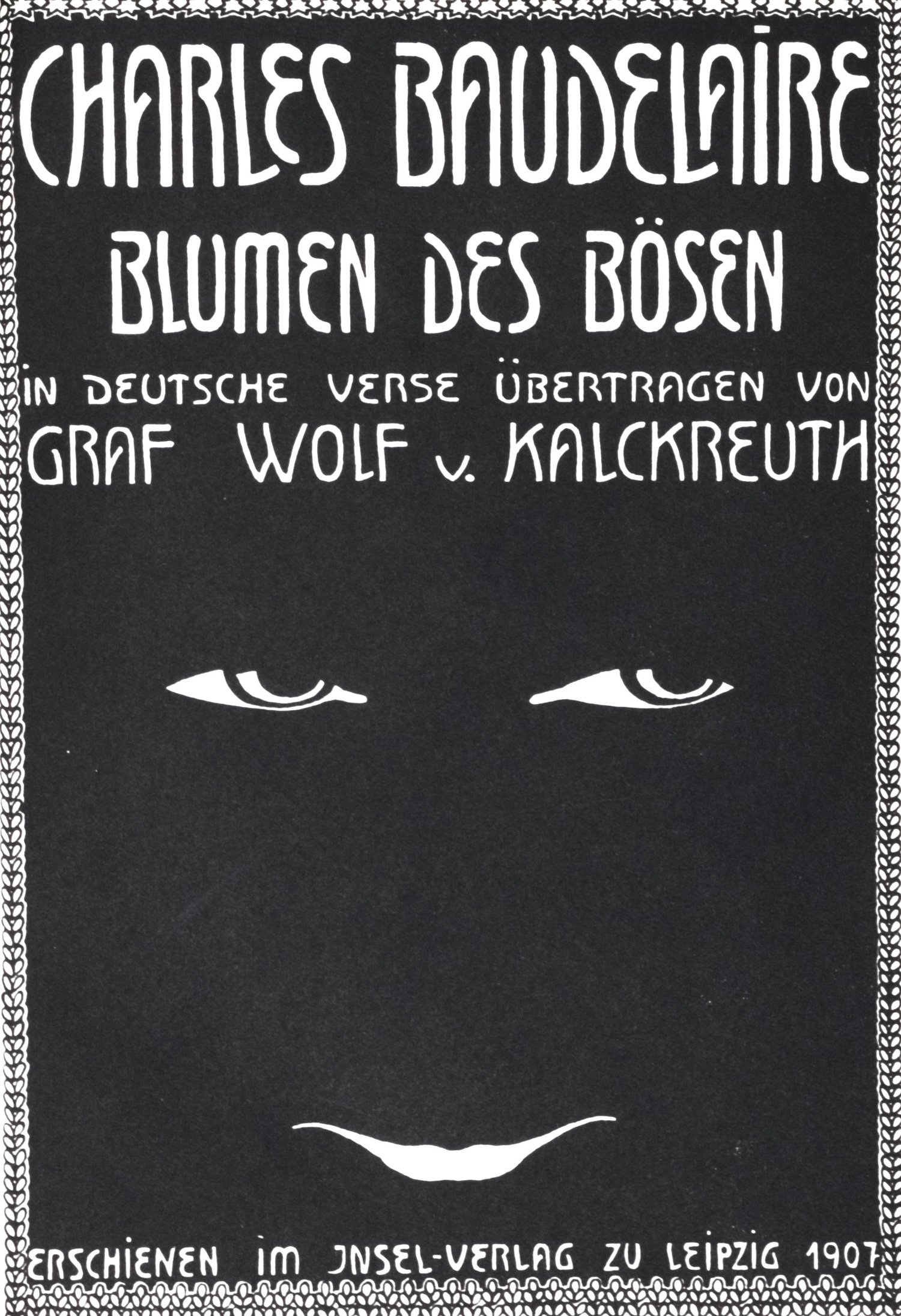 Baudelaire, Charles. Blumen des Bösen. In deutsche Verse übertragen von Graf Wolf v. Kalckreuth. 4 Bl., 155 S., 2 Bl. Mit illustriertem Titel und 6 Vignetten von H. W. Wulff. 19 x 13,5 cm. Weinrotes geglättetes OLeder (Kanten berieben) mit goldgeprägtem Rücken und goldgeprägtem VDeckeltitel sowie KGoldschnitt. Leipzig, Insel, 1907.