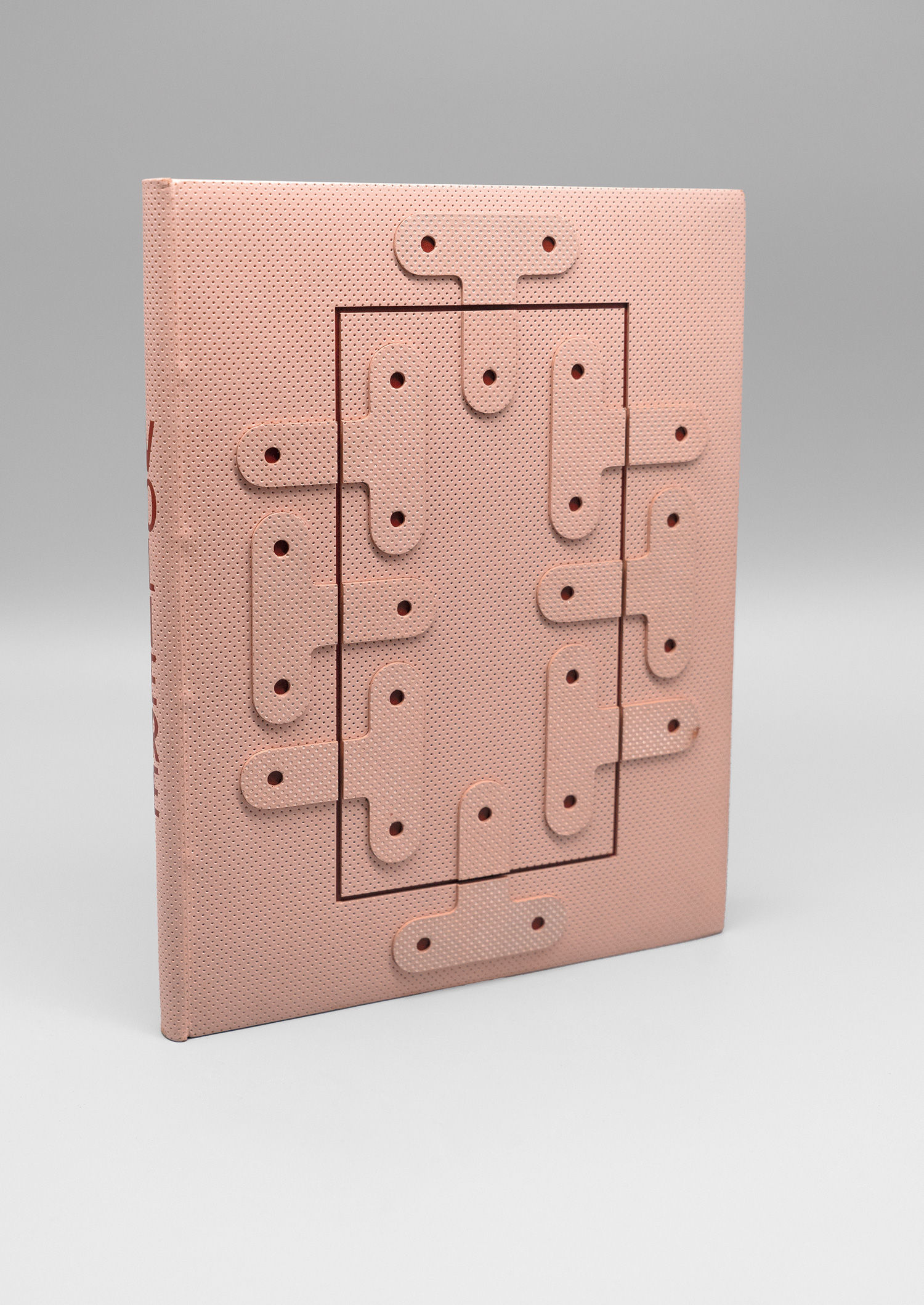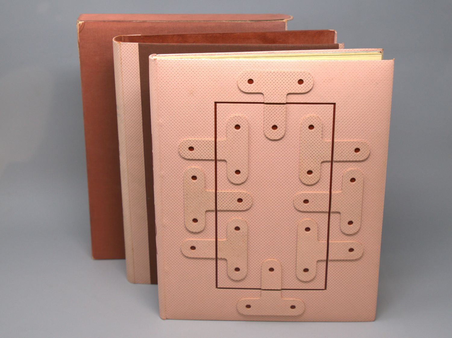 Breton, André, und Yves Tanguy. Volière. 26 Bl. Faksimilierter Text auf verschiedenfarbigem Karton und 1 S. mit 22 Zeilen Original-Manuskript von André in roter Tinte von André Breton; 3 Diagramme und 9 (4 ganzseitige Zeichnungen, davon 2 farbige montierte) Illustrationen nach Zeichnungen und Aquarellen sowie 4 Original-Zeichnungen auf einem am Schluss beigebundenen Blatt von Yves Tanguy. 28 x 21,5 cm. Roséfarbenes Leder d. Z. mit punziertem Lochstichmuster, Rücken mit Titel in brauner Lederintarsie, Deckel mit erhabenen T-Form-Lederapplikationen mit ähnlichem Lochmuster, jedoch mit Silberprägung und Enden mit braunem Lederintarsienpunkt sowie alle Schichten durchziehendem Rechteckrille auf beiden Deckeln, ebenfalls mit dunkelbraunem Grund. Dreiteilige Halblederchemise aus punktiertem roséfarbenem Leder mit Lederkanten und dunkelbraunem Seidenbezug, Doublüren und Vorsätze aus braunem Wildleder, in Rosé gefasstem Halblederschuber (nur dieser im Seidenbezug teils leicht brüchig, Kanten teils offen, kaum fleckig, gering verblasst; signiert an der unteren Innenkante in Silber "Leroux"). (Paris, Jacomet, für) New York, Matisse, 1963.