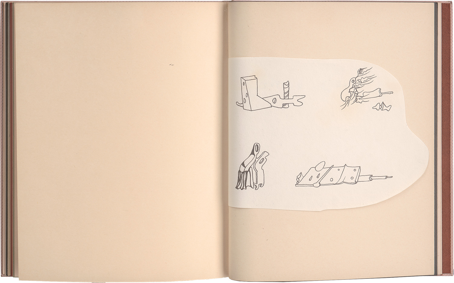 Tanguys vier Zeichnungen (rückseitig datiert 1942) wurden auf einem unregelmäßigen, wolkenförmigen weißen Büttenpapier in Tusche ausgeführt, sie alle illustrieren Tanguys einsamen Rang als Beschwörer des Sinns und der Figur in scheinbar abstrakt-kontingenten Umrissen. Dieses singuläre Exemplar wird von einem Einband des begnadeten Buchbinders Auguste Leroux (1871-1954) beschützt, er gehört zu seinen schöpferischsten Buchkunstwerken. – Kaum Gebrauchsspuren, in sehr guter Gesamterhaltung.