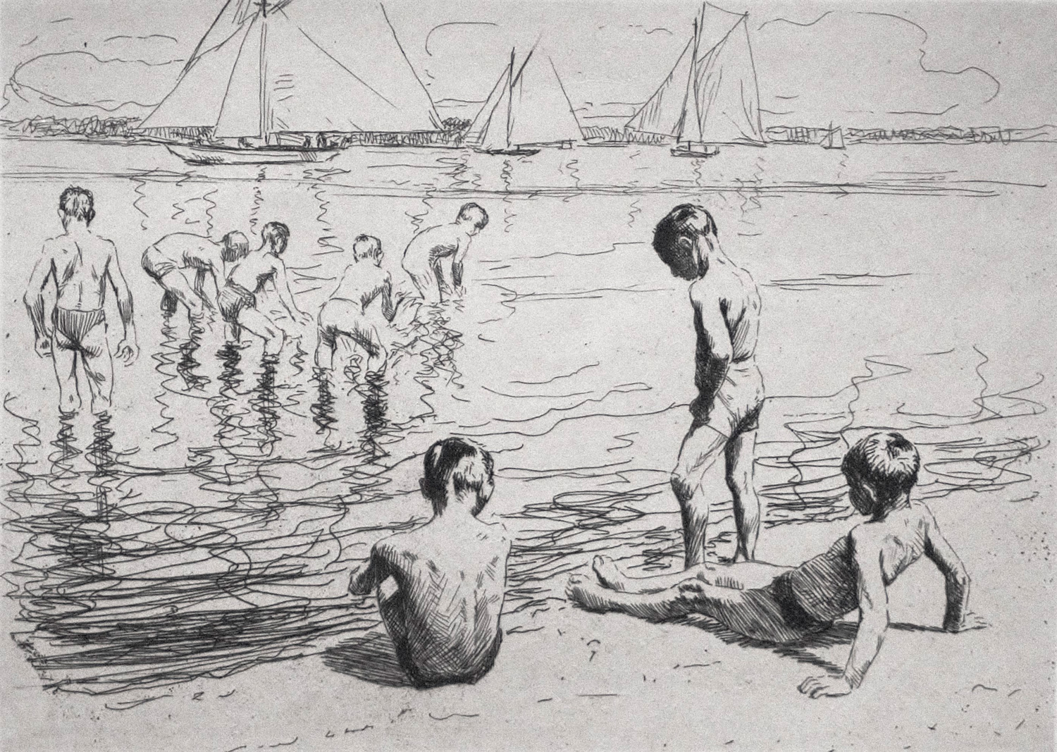 Heitere Uferszene mit mehreren Knaben beim Baden und Spielen, im Hintergrund drei Segelboote; die Wasseroberfläche ist mit feiner Linienführung und ihren Reflexionen lebendig wiedergegeben. – Leichter Eckknick. Druck insgesamt sehr kräftig und schön erhalten.
