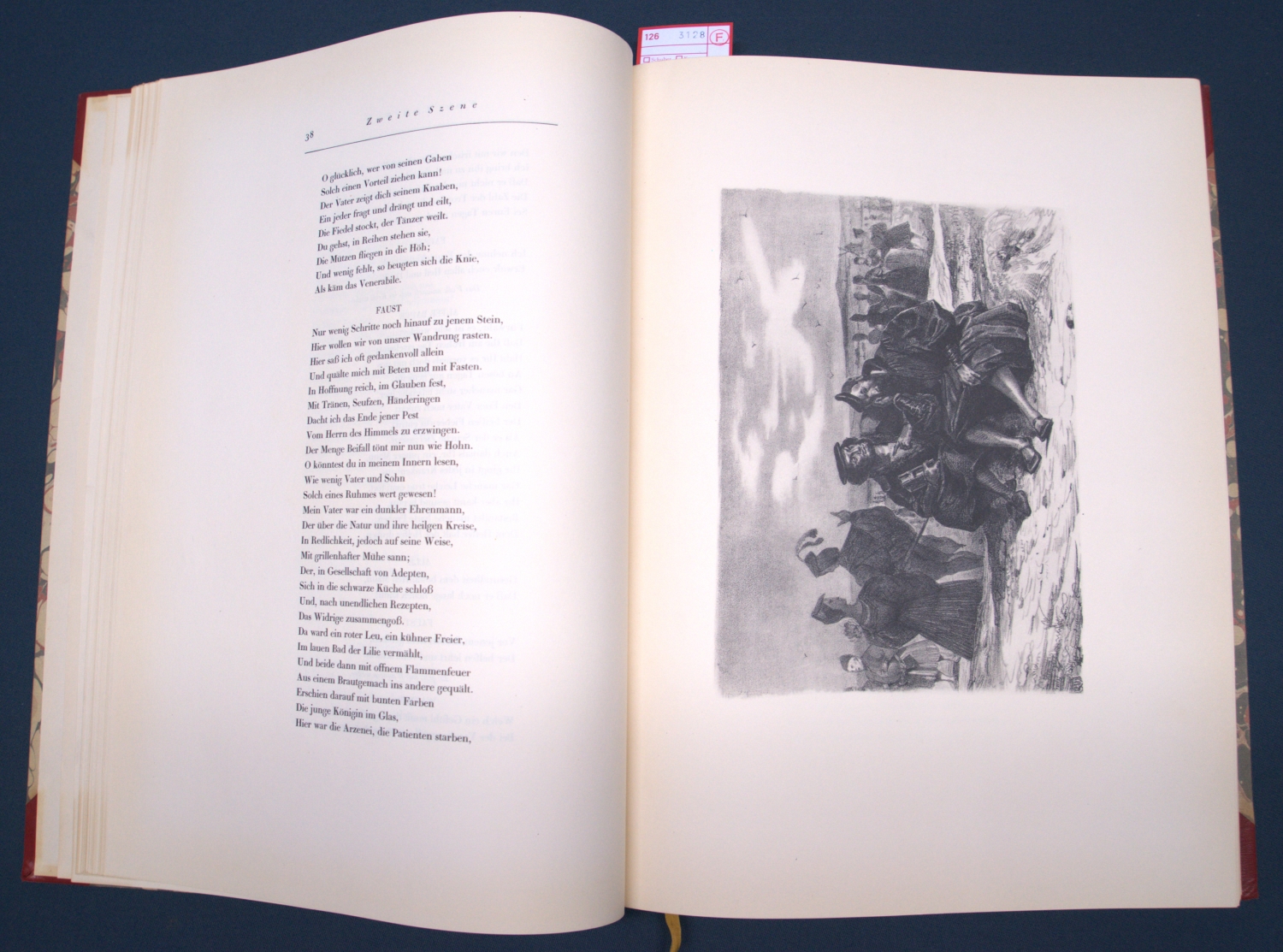 Goethe, (Johann Wolfgang von). Faust. Eine Tragödie. 2 Bl., 187 S., 1 Bl. Mit 17 Lichtdrucktafeln nach den Lithographien von Eugène Delacroix. 44,5 x 32 cm. Roter OHalblederband (etwas berieben, VDeckel mit kleinerer Schabspur; Entwurf: E. R. Weiß) mit reicher ornamentaler RVergoldung, goldgeprägtem RTitel und KGoldschnitt Leipzig, Insel, 1912.