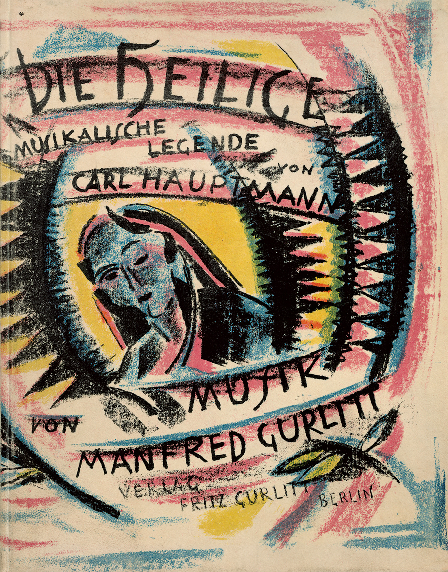 Hauptmann, Carl. Die Heilige. Musikalische Legende. Musik von Manfred Gurlitt. 103 S. Klavierauszug. Mit lithogr. sign. Titel und 4 signierten und nummerierten Original-Farblithographien von César Klein. 33,5 x 26 cm. Farbig lithogr. OPergamentband (etwas aufgebogen). Berlin, Fritz Gurlitt, (1922).