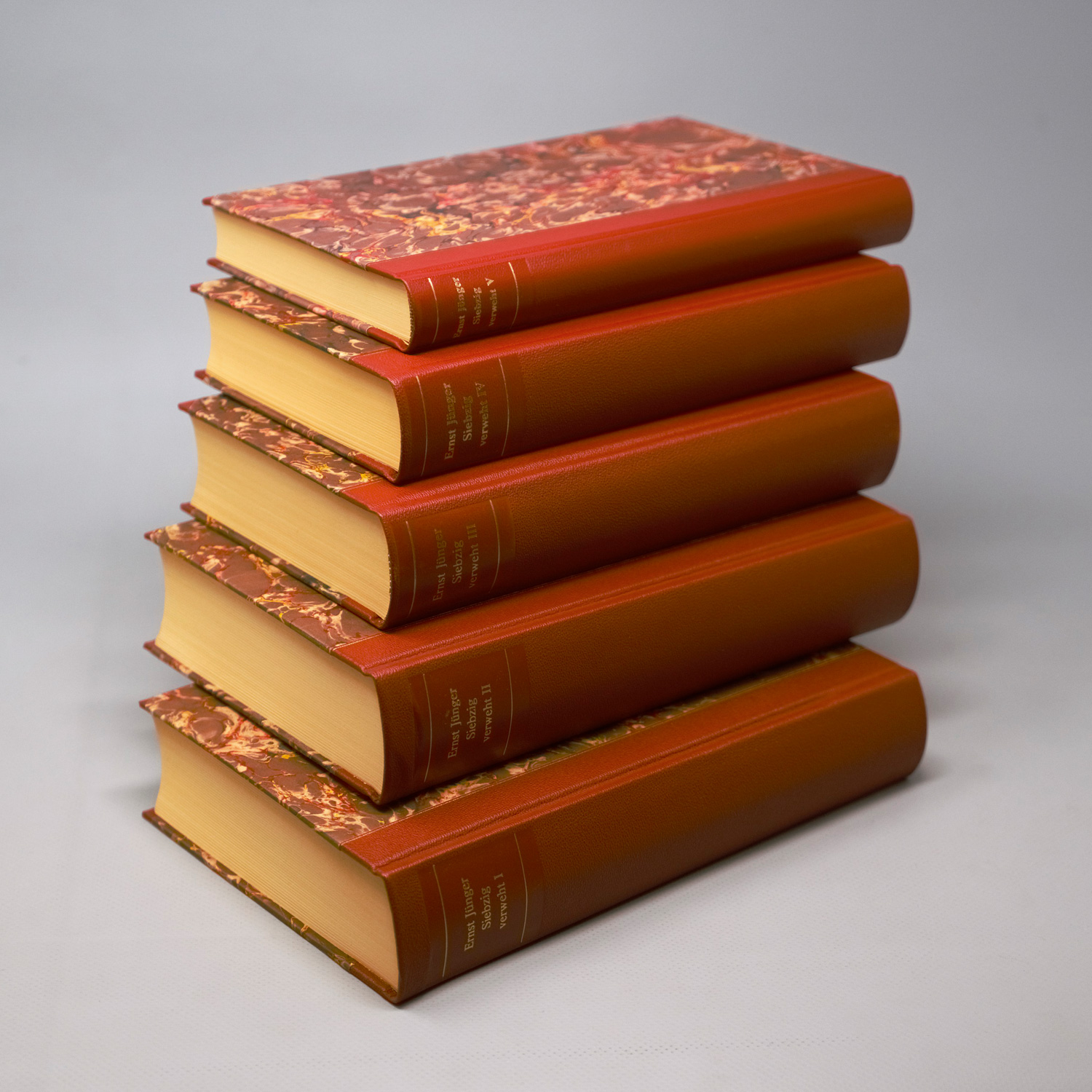 Jünger, Ernst. Siebzig verweht I-V (alles). 5 Bände. 22,5 x 14,5 cm (Bde I und II), 21 x 12,5 cm. OHalbleder, jeweils in OPappschuber. Stuttgart, Klett-Cotta, 1980-1997.