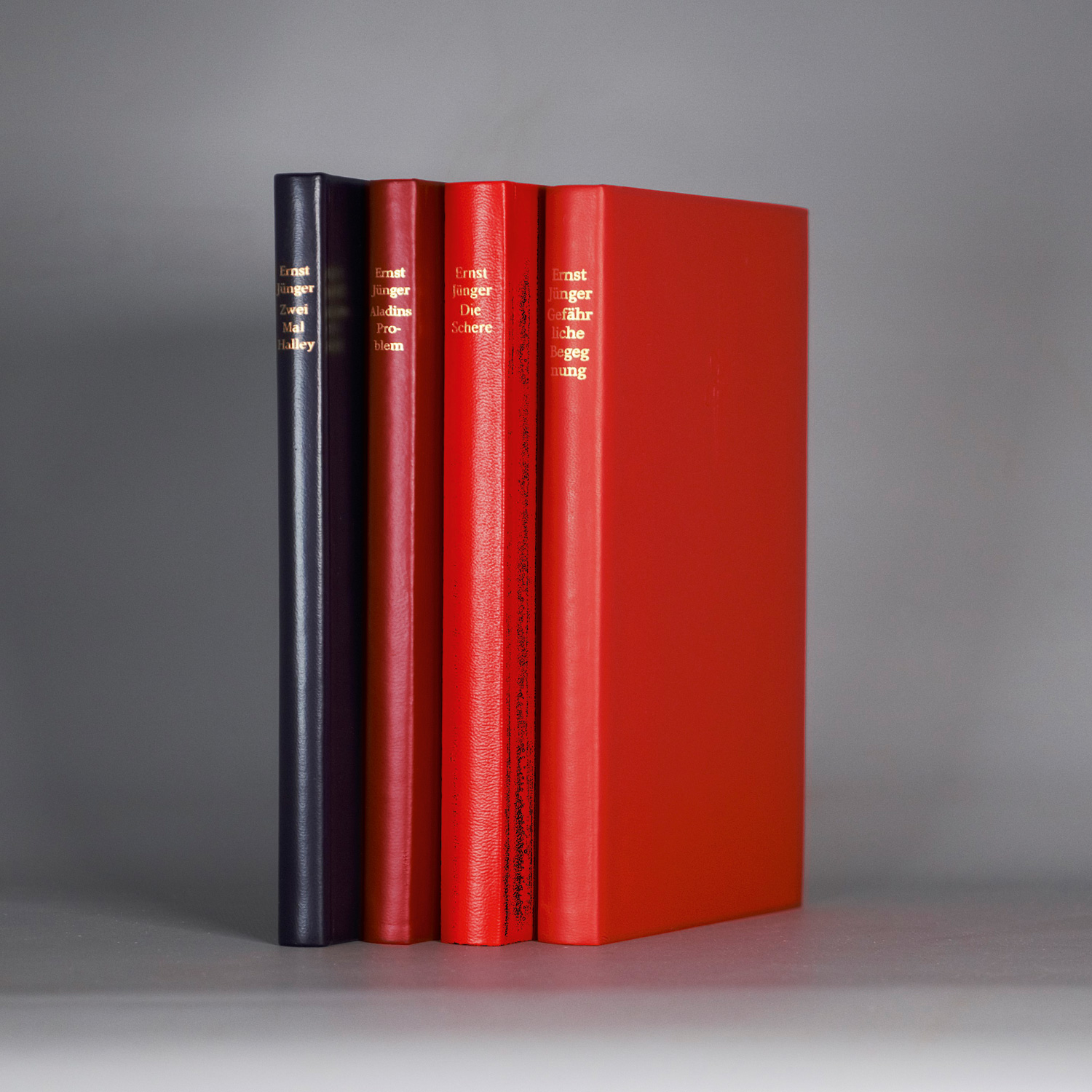 Erste Ausgaben. Jeweils eines von 300 bzw. 200 nummerierten Exemplaren der Vorzugsausgabe in verschieden farbigem Ganzleder. Druckvermerk von Jünger signiert. Enthält: 1. Aladins Problem. 1983. - 2. Eine gefährliche Begegnung. 1985. - 3. Zwei Mal Halley. 1987. - 4. Die Schere. 1990. – Verlagsfrisch.