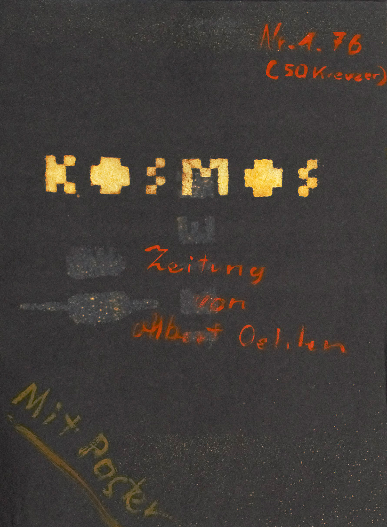 Mit Schablonendruck und Spritztechnik in Gold den Kosmos auf dünnstes Raschel-Seidenpapier bannendes Künstlermagazin mit Unikatcharakter. Die Sterne funkeln und gleißen, als Begriffe tauchen neben dem Titel "Kosmos" auf: 1 Bier, Mao Tse Tung, Weisheit, Rio, Rockn Roll, Obst. Auf dem Umschlag in Oehlens Handschrift die Nummer ("1.76"), der Preis ("50 Kreuzer"), der Titel ("Kosmos - Zeitung von Albert Oehlen") und die Angabe "Mit Poster" (das hier allerdings fehlt). – Tadellos.