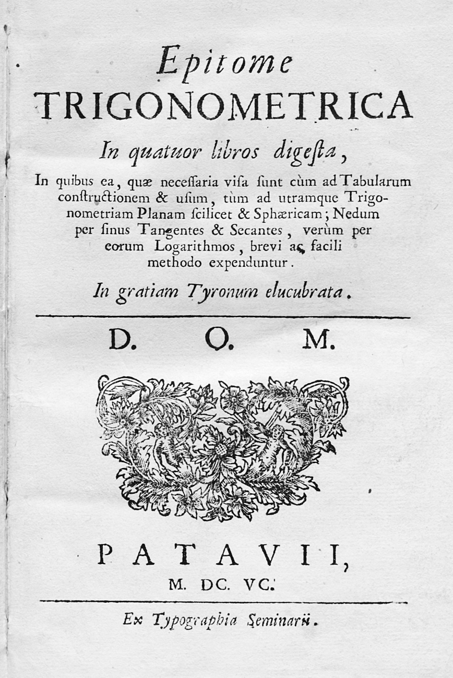 Epitome trigonometrica in quatuor libros digesta, in quibus ea, quae necessaria visa sunt cum ad tabularum constructionem & usum, tum ad utramque trigonometriam planam scilicet & sphaericam. 1 Bl., 133 S. Mit 4 mehrfach gefalteten Kupfertafeln. 18,5 x 13 cm. Pappband d. Z. (etwas stärker lädiert). Padua, Typographia Seminarii, 1695.