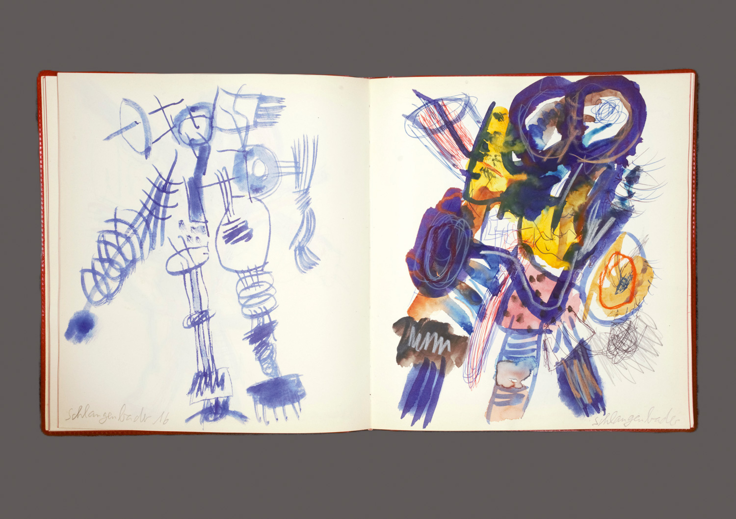 Vorhanden sind: I. Lanuba. Mit Orig.-Skizzen, -Fotografien und Kollagen. 1997. - Eines von 7 Exemplare (Gesamtauflage). - II. Printing on text and cover papers. Mit zahlreichen Orig.-Zeichnungen, -Fotografien und -Kollagen. Selbstverlag 2002. - III. Die Note. 28 lose Blätter mit Skizzen und Kollagen sowie eine CD. 2005. - Eines von 4 Exemplaren (Gesamtauflage). - IV. Arnika Große und Peter Schlangenbader. Aktionale. Mit 8-zeiliger Widmung des Künstlers. Berliner Künstler Verein 2010. - V. Privates Skizzenalbum. Mit zahlreichen Orig.-Zeichnungen, -Fotografien und -Kollagen. Wohl um 2011. - VI. Kultgefühle. Privates Skizzenalbum. Mit zahlreichen Orig.-Zeichnungen und -Kollagen. 2012-2016. - VII. Privates Skizzenalbum. Mit zahlreichen Orig.-Zeichnungen, -Fotografien und -Kollagen. 2016. - VIII. Privates Skizzenalbum. Mit zahlreichen Orig.-Zeichnungen, -Fotografien und -Kollagen. 2016. - IX. Hermann Ebling und Evelyn Weissberg (Hrsg.). Schlangenbader. Mit 5-zeiliger Widmung des Künstlers. Edition Friedenauer Brücke 2016. - X. Hermann Ebling und Evelyn Weissberg (Hrsg.). Zomby Vegan. Mit 7-zeiliger Widmung des Künstlers. Edition Friedenauer Brücke 2020. – Mit kleinen Gebrauchsspuren, sonst gute Exemplare.
