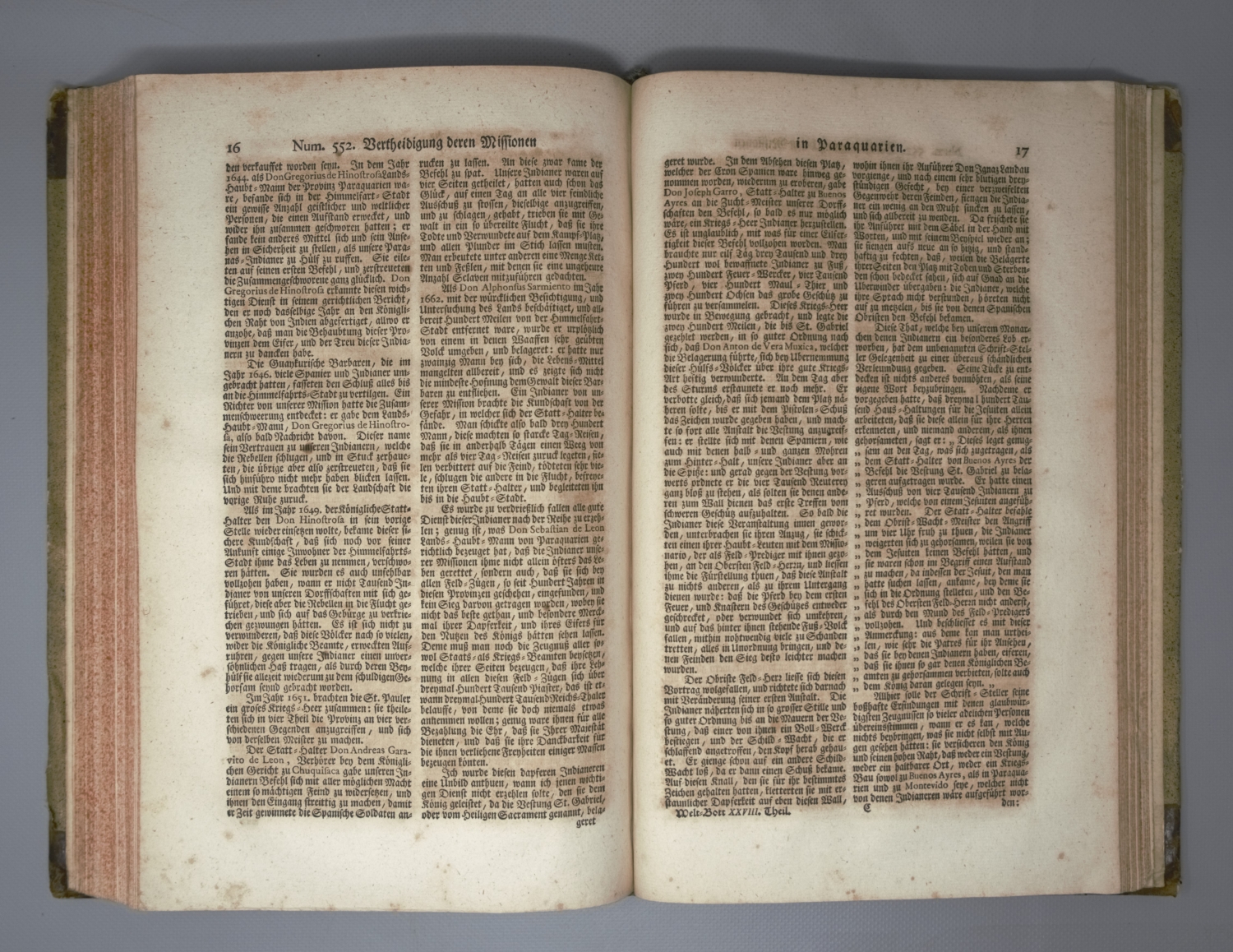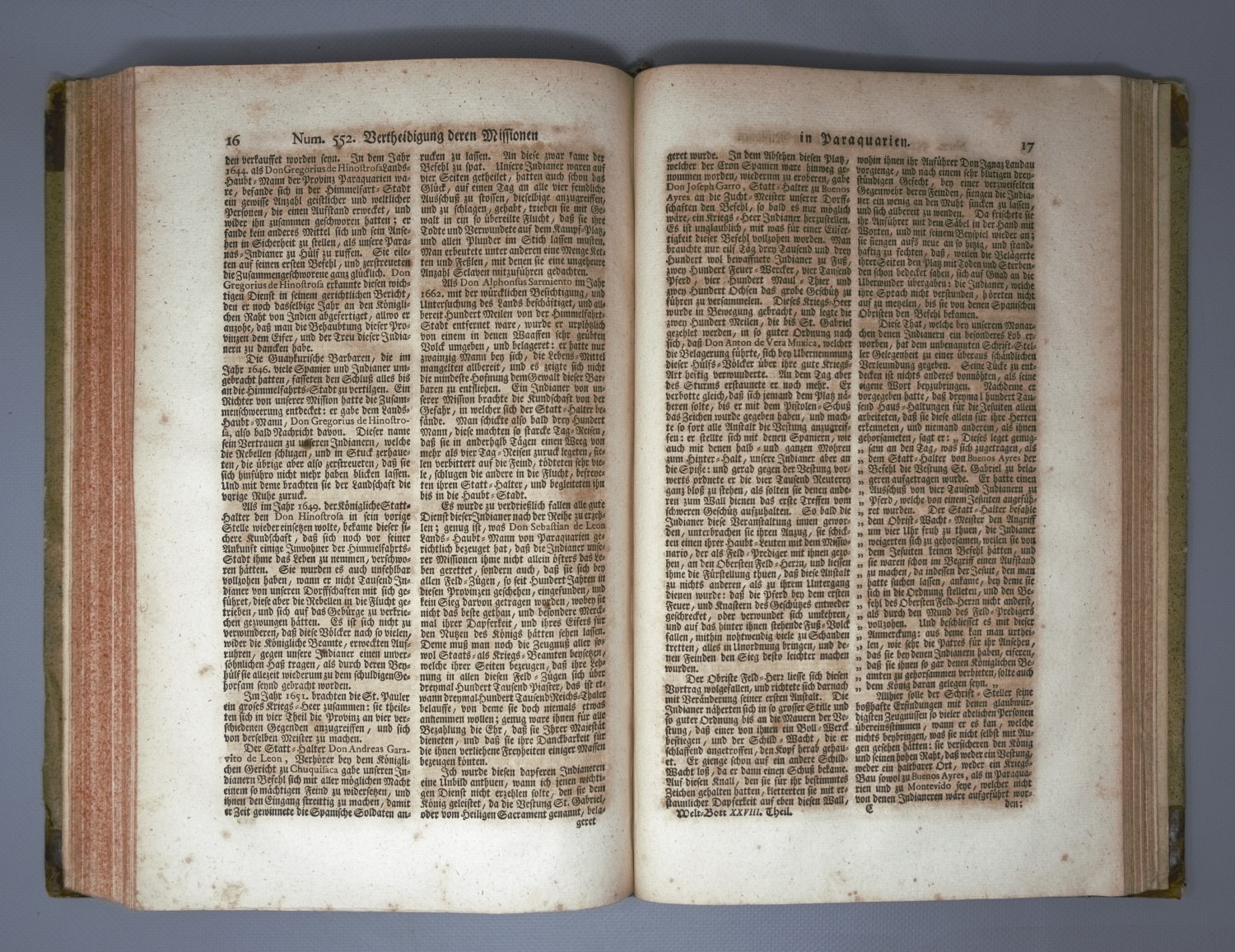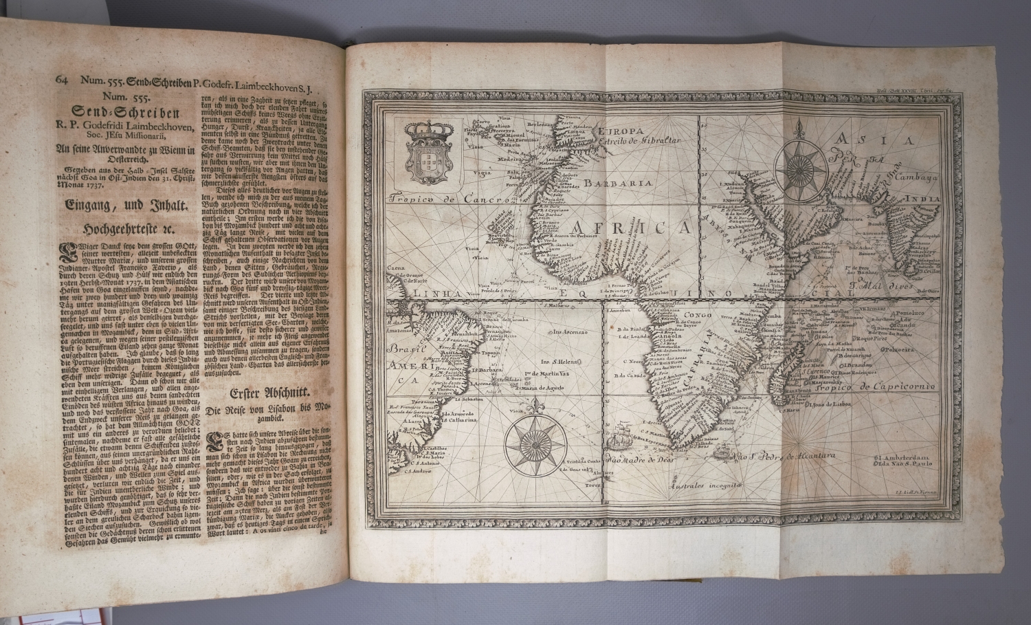 Der neue Welt-Bott Tomus IV. Streit I, 838. De Backer-Sommervogel VII, 1586. Sabin 91981. Palau 322.590. Cordier, BS 941f. – In sich geschlossener Band IV der von 1726 bis 1761 in insgesamt 38 Teilen erschienenen und von Josef Stöcklein herausgegebenen Sammlung von Berichten über Reisen und Missionsgründungen der Jesuiten in Amerika, Asien und Afrika, auch als "Welt-Bott" bekannt, zugleich eine der bedeutendsten Quelle der Missionsgeschichte des 18. Jahrhunderts. "Der Wert dieser Sammlung besteht darin, daß Stöcklein eine große Anzahl von Briefen veröffentlicht, die von deutschen Missionaren stammen" (Streit). Die drei Faltkarten zeigen die Philippinen, Paraguay und Afrika. – Etwas braunfleckig, sonst wohlerhalten.