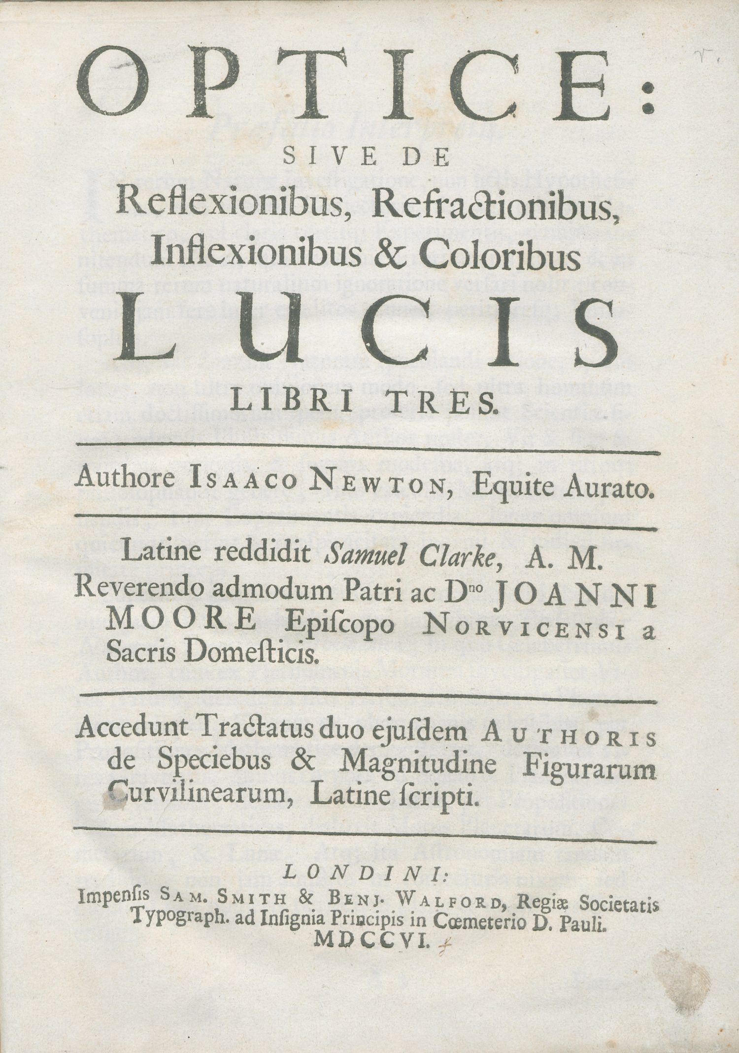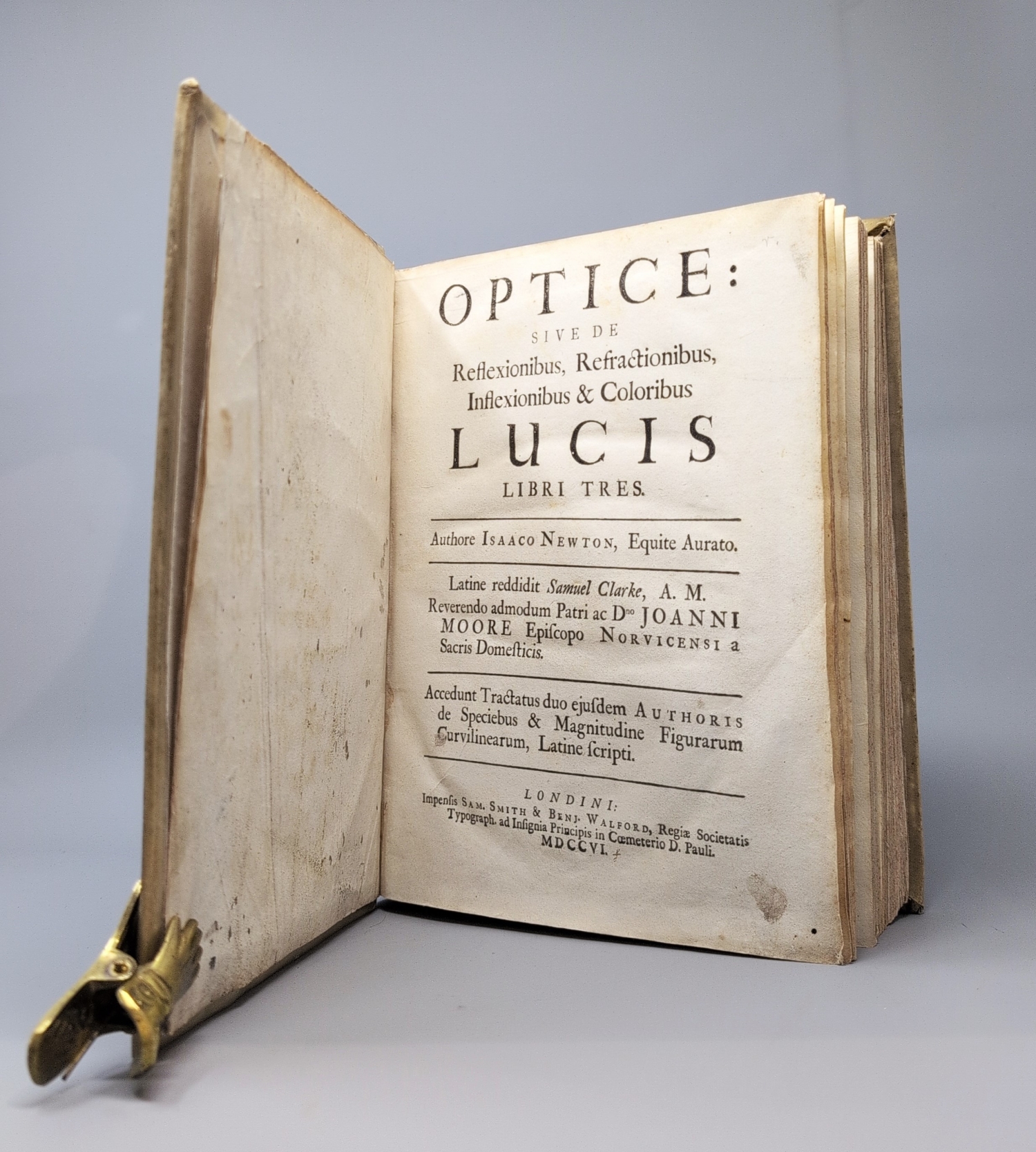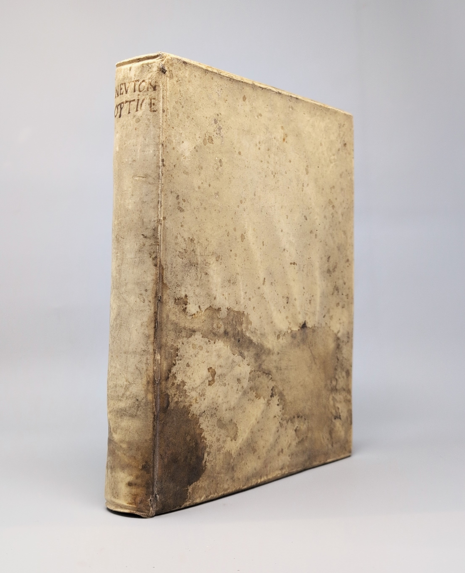 Newton, Isaac. Optice: Sive de reflexionibus, refractionibus, inflexionibus & coloribus lucis libri tres. Latine reddidit Samuel Clarke. 7 Bl., 348 S., 1 Bl., 24 S., 1 Bl., 43 (recte: 47) S. Mit einigen schematischen Textholzschnitten und 6 (statt 19) gefalteten Kupfertafeln. 24 x 18,5 cm. Pergament d. Z. (etwas fleckig und berieben). London, Smith & Walford, 1706.