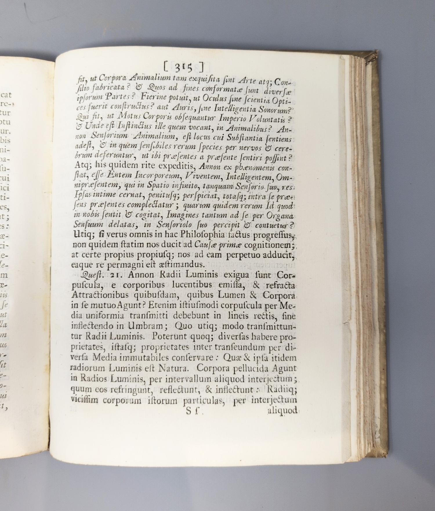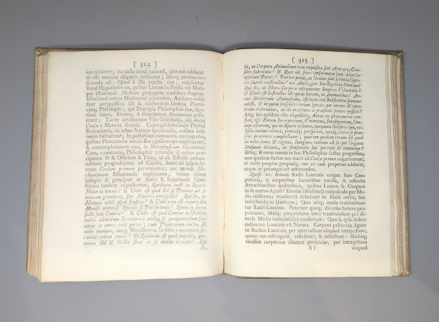 Poggendorff II, 277. Wallis 179. Babson 137. Honeyman 2326. DSB X, 56. – Erste lateinische Ausgabe. "In the Opticks, Newton presented his main discoveries and theories concerning light and color in logical order." (DSB). "This edition is important not only for the fact that it was carefully read and corrected by Newton but also for the first printing Newton's views on Iceland spar and six additional questions on the nature of polarised light and speculations about light and atomic structure. It also has been pointed out that the book contains a very early description of sulphuric ether which gives it a place in the early history on anaesthesia" (Lawson). – Es fehlen 13 Kupfertafeln. Leicht fleckig, fl. Vorsatz mit angestückter Ecke.