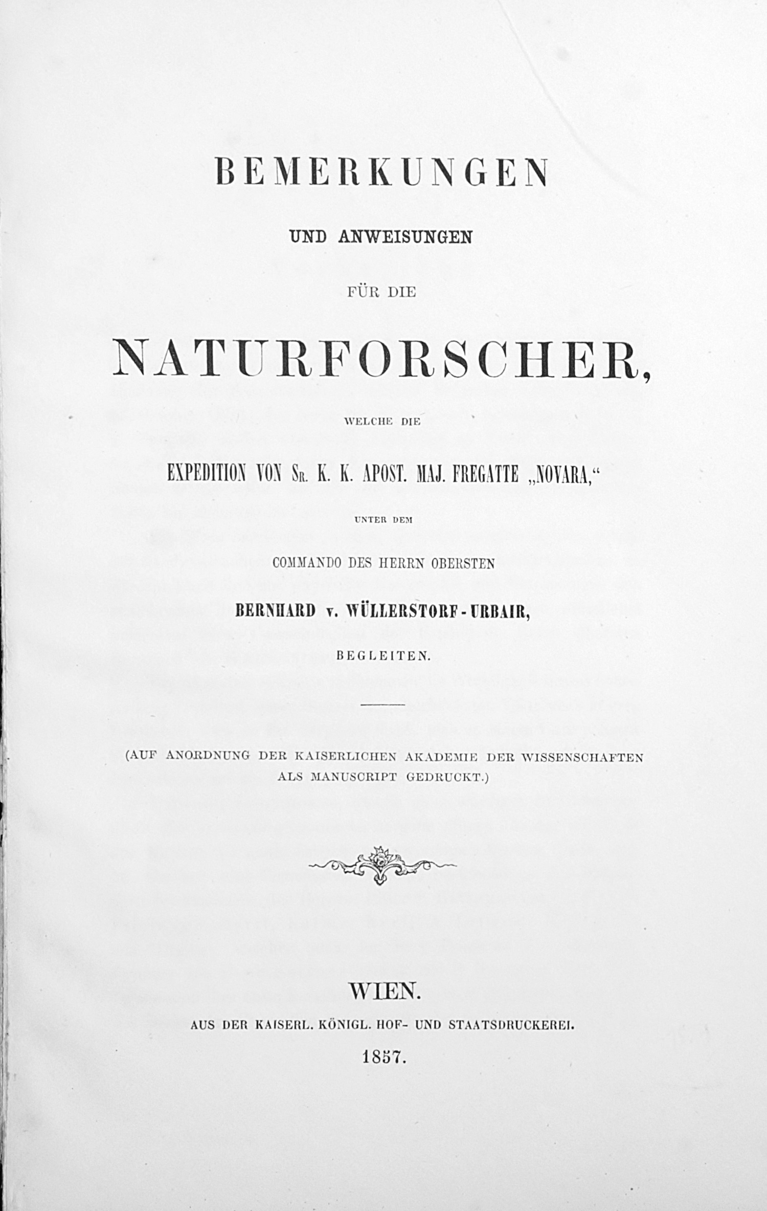Wüllerstorf-Urbair, Bernhard von. Bemerkungen und Anweisungen für die Naturforscher, welche die Expedition von Sr. K. K. Apost. Maj. Fregatte "Novara". VI, 146 S. 24,5 x 15 cm. OBroschur (fleckig und Rücken im Block gebrochen, Kapitale mit Fehlstellen) mit DTitel. Wien, Kaiserl. Königl. Hof- und Staatsdruckerei, 1857.