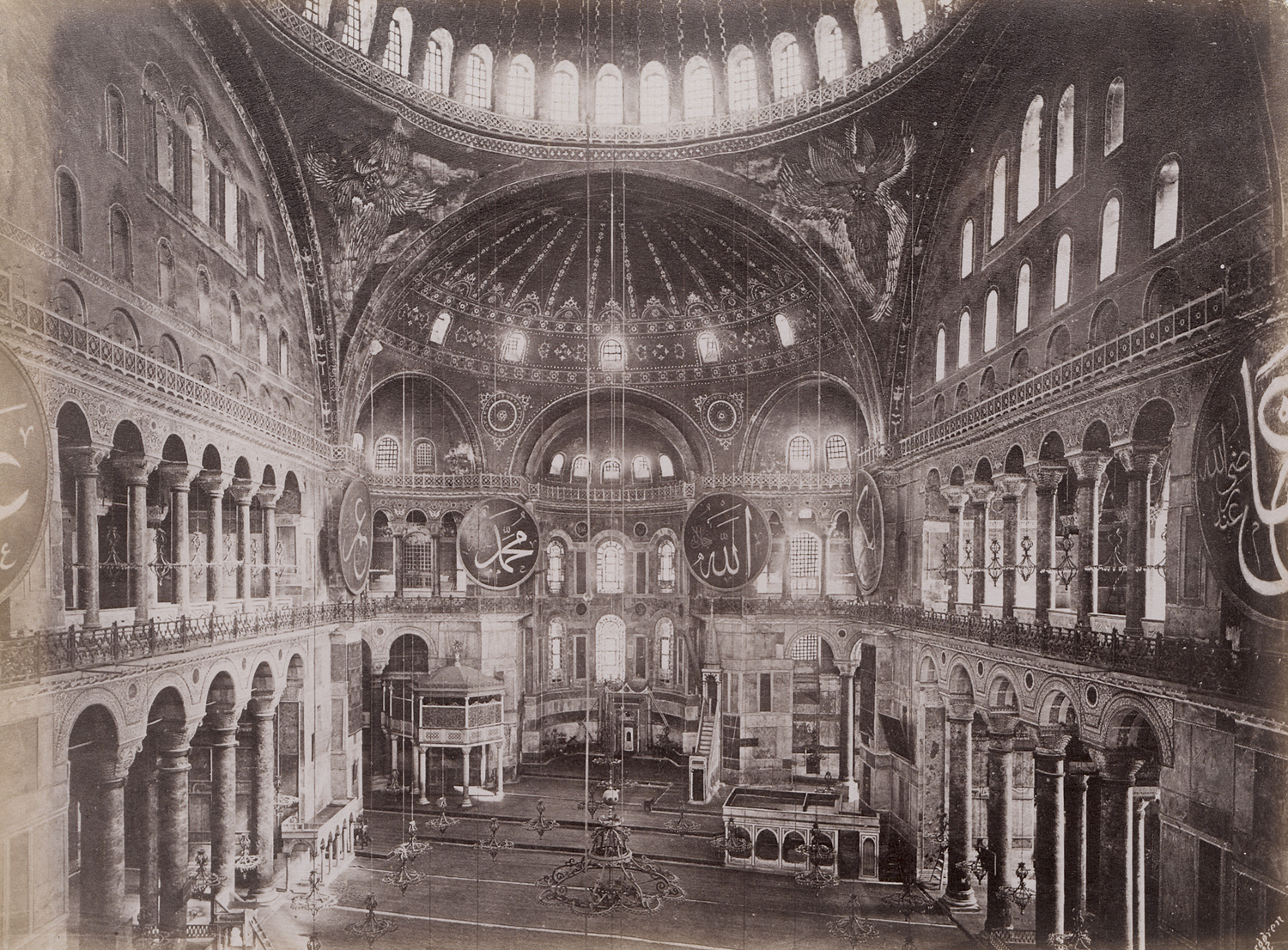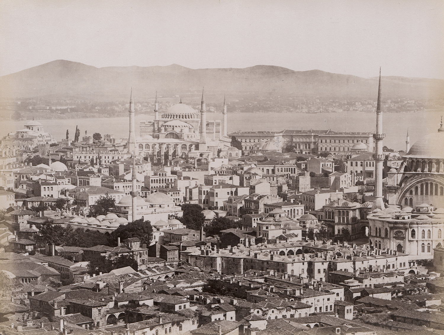 A rich and varied group of late 19th-century views of Constantinople by the Swedish-born photographer Guillaume Berggren, who established one of the most successful studios in the city. The photographs include wide city panoramas and detailed views of key landmarks such as the Hagia Sophia, Dolmabahçe Palace, the Galata Bridge, and the city walls, as well as animated scenes of everyday life along the Bosphorus. Among them is a striking image of a large military formation assembled in front of the Nusretiye Mosque, offering a rare glimpse into the ceremonial practices of the Ottoman Empire. Characterized by strong compositions and crisp detail, Berggren’s images reflect both documentary precision and an eye for atmospheric and architectural nuance. – Some fading and light scuff marks on some prints as well as age stains on one print, otherwise all in good to very good condition.