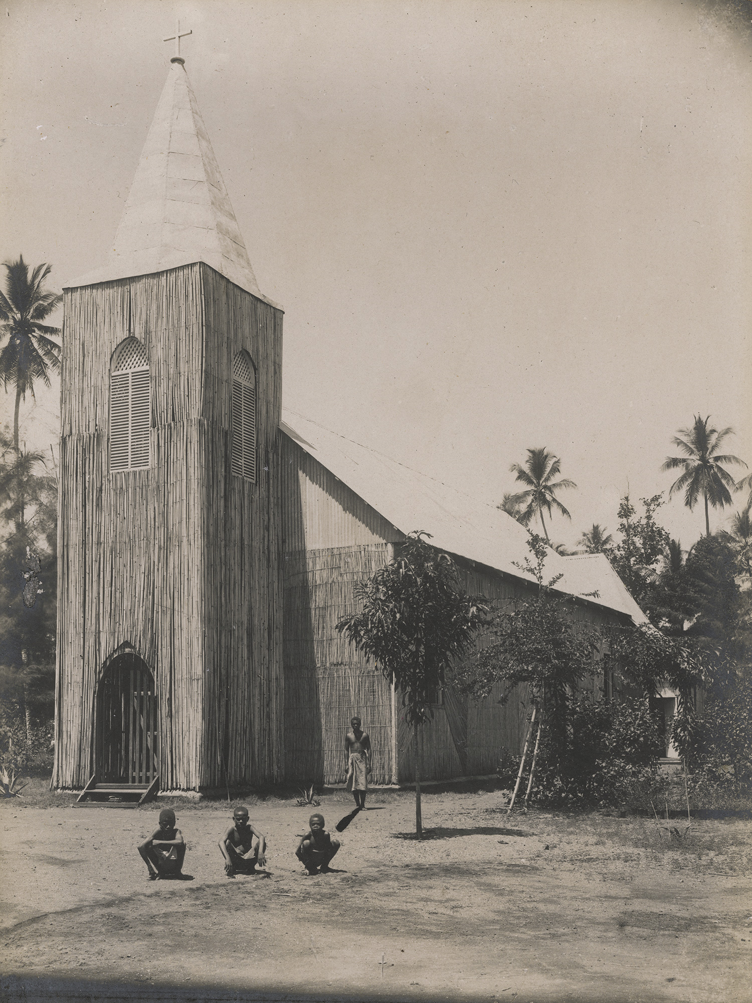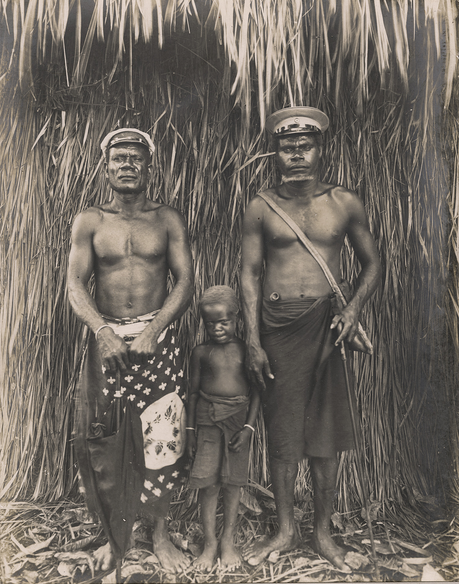 This group of photographs offers a rich visual record of life in the German colonial Pacific during the late 19th and early 20th centuries. Likely taken by a missionary-affiliated or ethnographic photographer, the images depict a variety of subjects including Samoan families and women in ceremonial dress, Fijian schoolchildren in front of a thatched classroom, local architecture such as a bamboo church, and the construction of a large traditional meeting house. Other scenes include local converts and indigenous pastors, formal group portraits, and a canoe landing on the beach in the former German protectorate of New Guinea. – Some soiling and foxing of boards, some fading and signs of oxidation along the margins of a number of prints, otherwise all in good to very good condition.