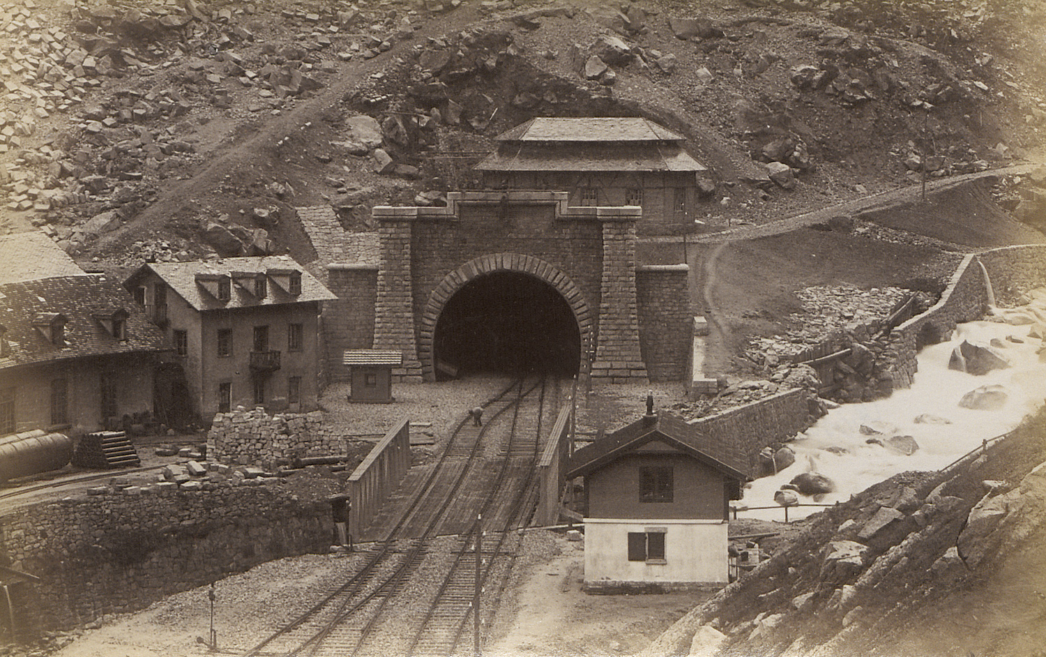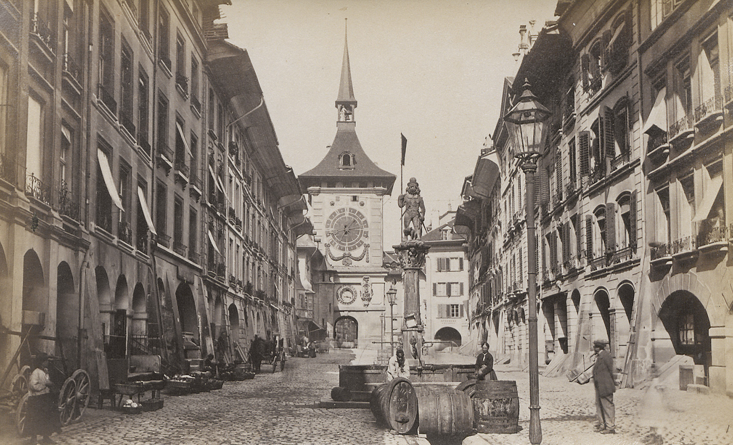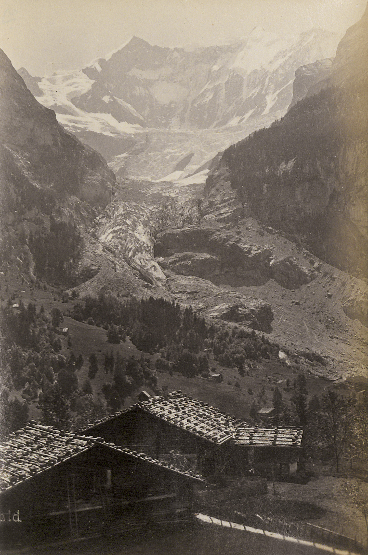 The album includes a wide-ranging selection of city and landscape views from Switzerland and surrounding regions, among them Zurich, Lucerne, Brunnen, Axenstein, the Axenstrasse, the Gotthard Railway, Andermatt, the Rhône and Grindelwald Glaciers, Wengernalp, Mürren, Bad Leuk and the Gemmi Pass, Monte Rosa, Breithorn, Chamonix with Mont Blanc, the Mer de Glace (several views), Zermatt with the Matterhorn, Vernayaz, Montreux, Nyon, Geneva, Fribourg, Bern, Basel, and Strasbourg Cathedral. The album was most likely compiled by the Berlin banker Paul Bercht (1847-1899), whose name is stamped on the cover. – Edges of album worn, canvas rippled, pages buckled and some with light foxing, some prints with light fading in edges, first prints with slight insect damage, otherwise most with strong tones and in good to very good condition.