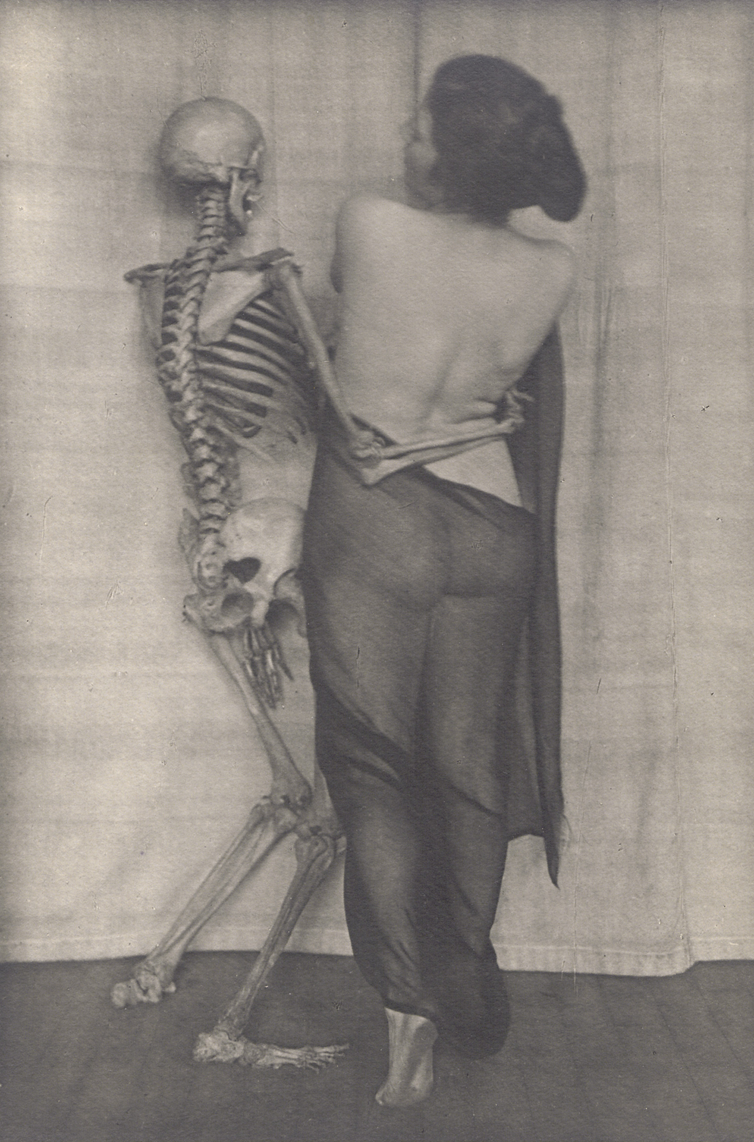 Portfolio series: “Narre Tod, Mein Spielgesell”. Circa 1922. 10 vintage gelatin silver prints. Various sizes, between 21 x 14 cm, 15,5 x 15 cm and 14,5 x 20,2 cm. Each mounted to colored card, with printed title page. Presented in original half-linen portfolio with gilt-stamped title label "Narre Tod, Mein Spielgesell" on front cover.