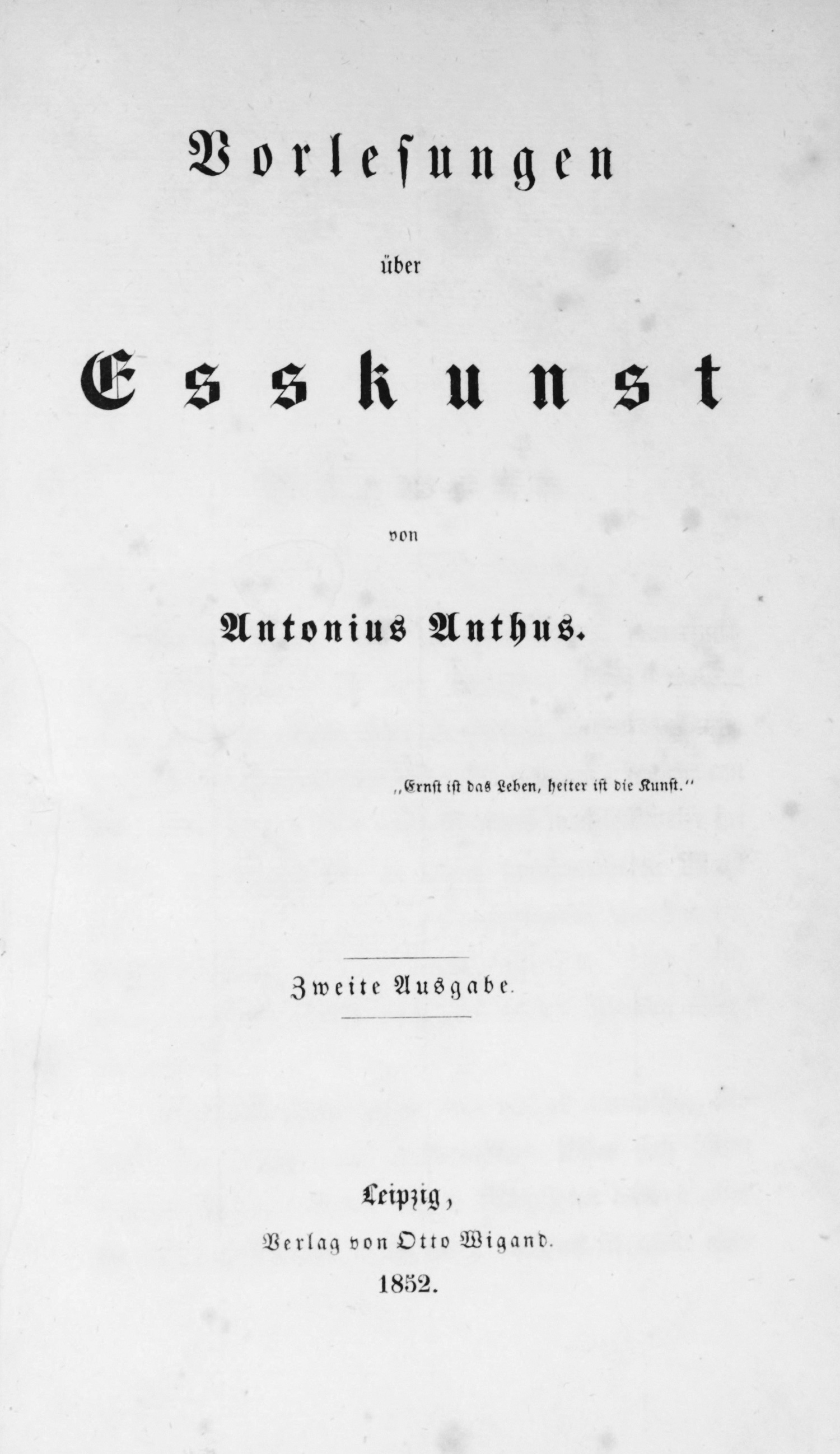 (Blumröder, Gustav Philipp; Pseud.:) Antonius Anthus. Vorlesungen über Esskunst. Zweite Ausgabe. VIII, 276 S. 21,5 x 12,5 cm. Moderner Pappband. Leipzig, Wigand, 1852.