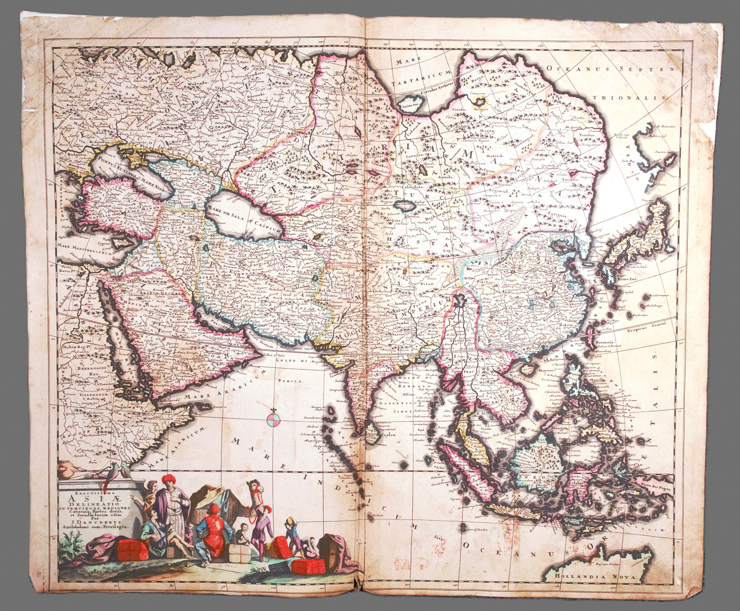 Yeo (Asia), 81. – Die Asienkarten zeigt neben China, Japan und vielen verschiedenen Inseln, auch Teile Europas sowie den nördlichen Teil Australiens ("Hollandia Nova"). – Mit Mittelfalz. Papierbedingt gebräunt, braun- und fingerfleckig sowie mit hinterlegten Einrissen und Fehlstellen an den oberen Ecken und an der Mittelfalz.