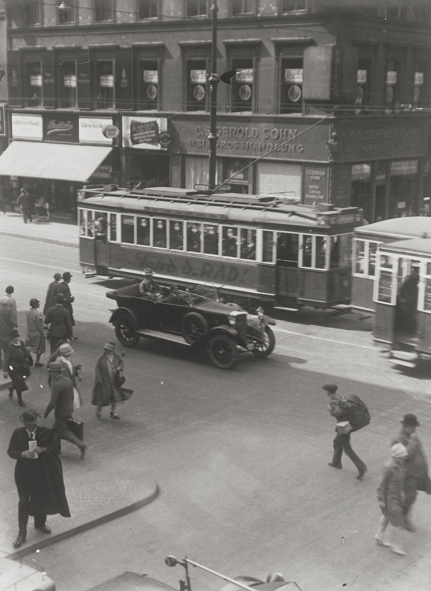 Berlin street scene. Circa 1927. Vintage gelatin silver print. 22,7 x 16,4 cm. Photographers's copyright stamps (Berlin and Brussels) as well as numbered and annotated in pencil and red ink on the verso, hinge-mounted in upper edge in mat.