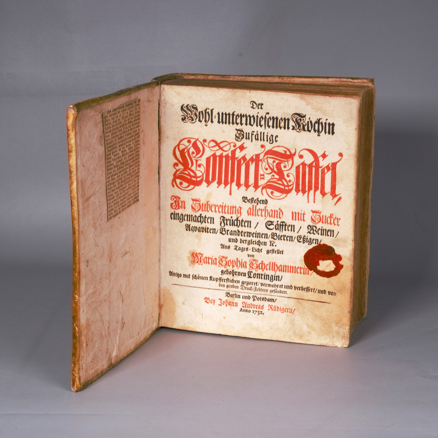 VD18 10437991. Weiss 3389 Anm. Horn-Arndt 196 (Ausgabe 1699, ohne Tafeln). – Sophie Schellhammer (1647-1719) war Tochter des Altdorfer Polyhistors Herman Conring (1606-1681) und heiratete später den Arzt Christian Schellhammer (1649 -1716) in Helmstedt. Ihr Kochbuch erschien erstmals 1692 anonym unter dem Titel "Die wohl unterwiesene Köchinn", weitere Ausgaben folgten 1697 (anonym), 1704 (ersmals unter dem Namen der Autorin) und 1713. – Erstes weißes Blatt lose und mit modernem Exlibris. Titel mit rotem Lacksiegel (mit Fehlstelle). Innengelenk am Titel offen. Etwas braun- und fingerfleckig, teilweise feuchtrandig sowie mit Wurmgängen.