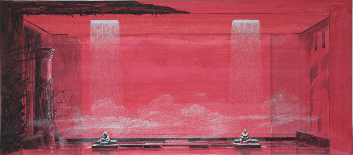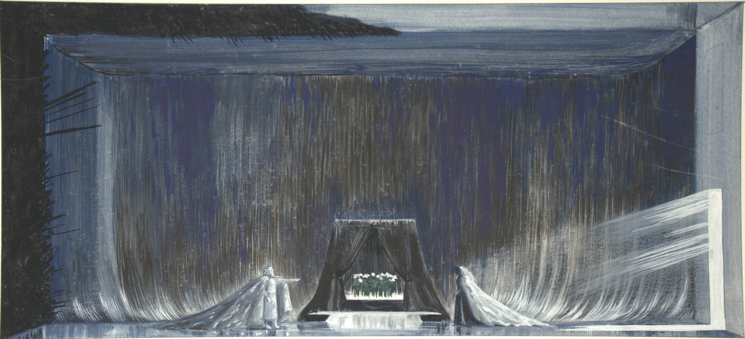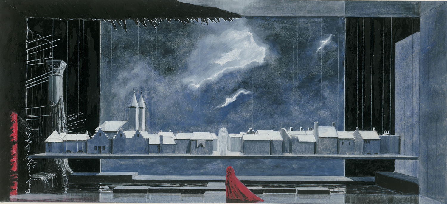 Halmen, Pet. 5 Wagnersche Szenenbilder. Original-Bühnenbildentwürfe. Gouache über Graphit, weißgehöht auf festem Karton. Je 20 x 44 cm (Darstellung) und 44 x 62,5 cm (Blatt). In dunkelblauer Halbleinenflügelmappe mit montierten DSchildern. Deutschland um 1985.