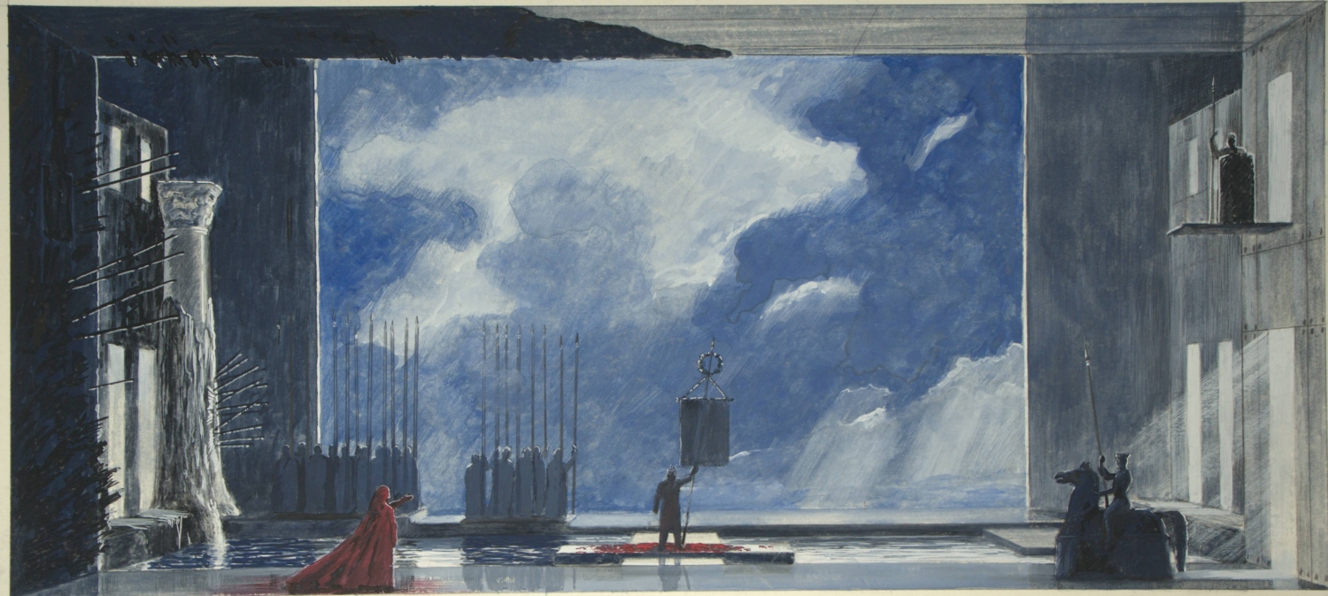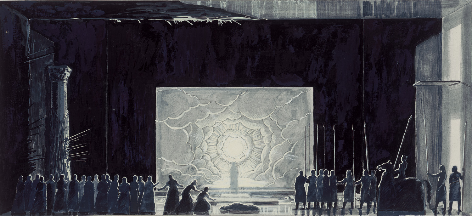 Fünf düstere, gewichtige Szenenbilder der Opern Wagners. Farbtöne von tiefem Dunkelblau, Grau und Schwarz beherrschen die Entwürfe. – An den weißen Rändern teils leicht fleckig, Ecken bestoßen, sonst in guter Erhaltung.