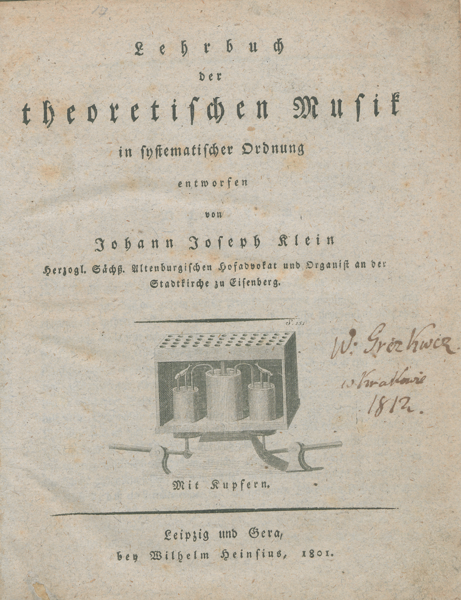 TNG X, 102. Eitner V, 383. Fétis V, 48. MGG VII, 1205. Riemann-Einstein 594. Vgl. RISM B VI/1, 455 (Ausgabe Offenbach "c 1800). Nicht bei Hirsch und Wolffheim. – Erste Ausgabe in Quarto. Im selben Jahr erschien in Offenbach eine undatierte Oktavausgabe. Systematische Musiklehre und Instrumentenkunde in 3 Hauptstücken. Klein untersucht in Teil 1 Entstehung und Fortpflanzung des Schalls, Fragen der Resonanz und der Gehörphysiologie. In Teil 2 mißt er die Intervalle und berechnet sie für das diatonische und das chromatische Geschlecht. Nach Vorstellung verschiedener Arten, Näherungswerte für die temperierten Töne zu errechnen, folgt eine Stimmanleitung für Tasteninstrumente. Teil 3 über Mittel der Tonerzeugung behandelt Stimmphysiologie, Gesang und Musikinstrumente. Klein systematisiert sie nach der Art der Tonerzeugung: "Bemerkenswerte Ansätze zu den heute üblichen Einteilungsprinzipien. In den meisten Fällen werden Bau und Spielweise der Instrumente genau beschrieben. Am ausführlichsten geht Klein auf die Tasteninstrumente ein, vor allem auf die Orgel" (MGG). Tafel III zeigt Kleins Darstellung des enharmonischen Systems. Die Kupfer zeigen u. a. Grifftabellen für Fagott, Oboe, Kornett, Piccoloflöte, Querflöte, Klarinette und Flageolett. – Gebräunt und stockfleckig, teilweise leicht wasserrandig. Titel mit Besitzvermerk von 1812 und kleiner hinterlegter Fehlstelle im Fußsteg. Vorsatz mit hs. Widmung von 1938.