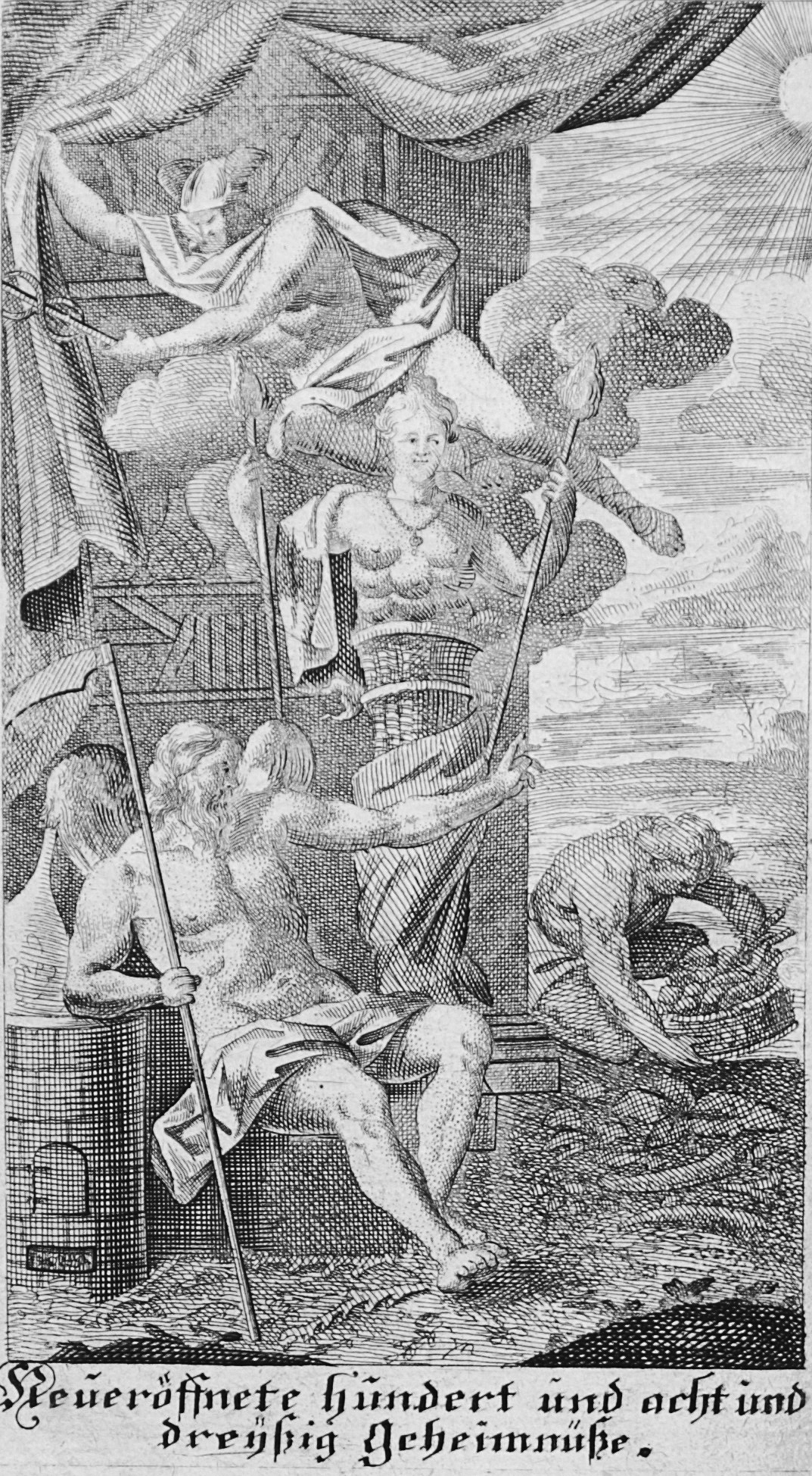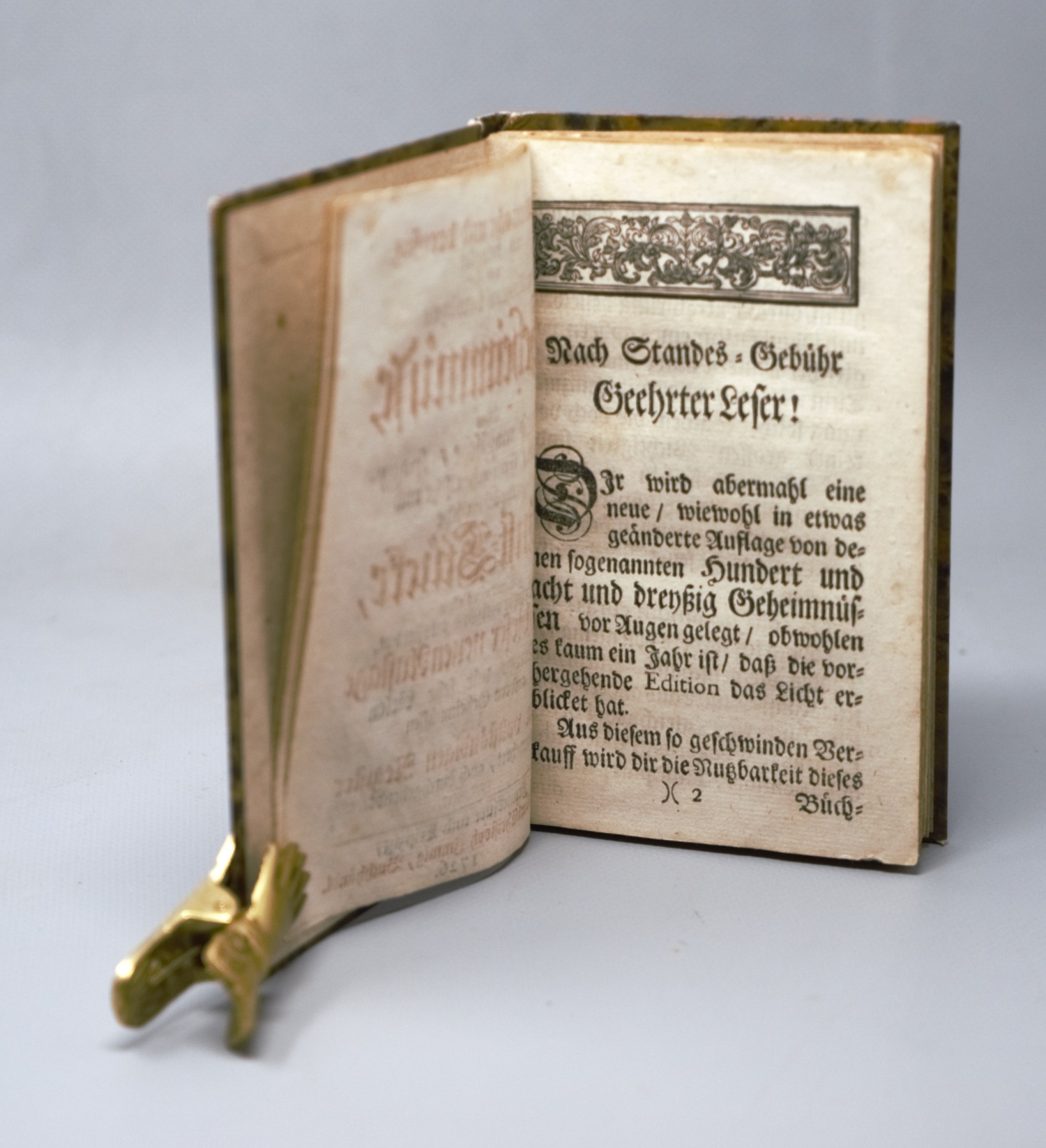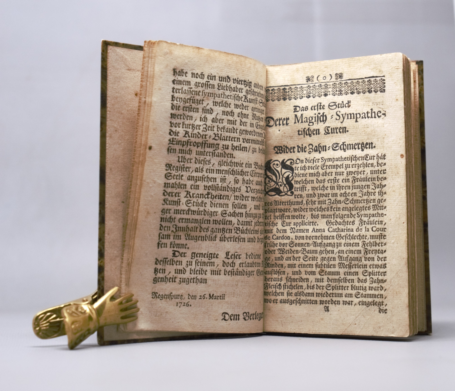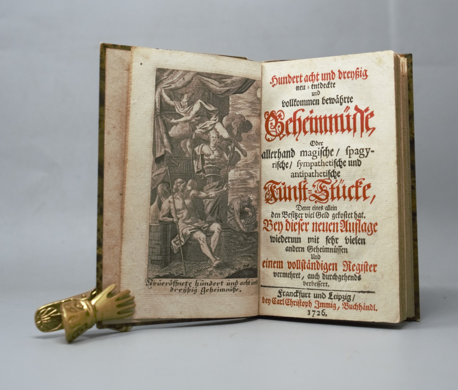 Hundert acht und dreyßig neu-entdeckte und vollkommen bewährte Geheimnüsse oder allerhand magische, spagyrische, sympathetische und antipathetische Kunst-Stücke. Bei dieser neuen Auflage wiederum mit sehr vielen andern Geheimnüssen und einem vollständigen Register vermehret, auch durchgehends verbessert. 3 Bl., 164 S., 4 Bl. (Register). Titel in Rot und Schwarz. Mit gestochenem Frontispiz. 16 x 10 cm. Neuerer marmorierter Pappband. Frankfurt und Leipzig, Carl Christoph Immig, 1726.