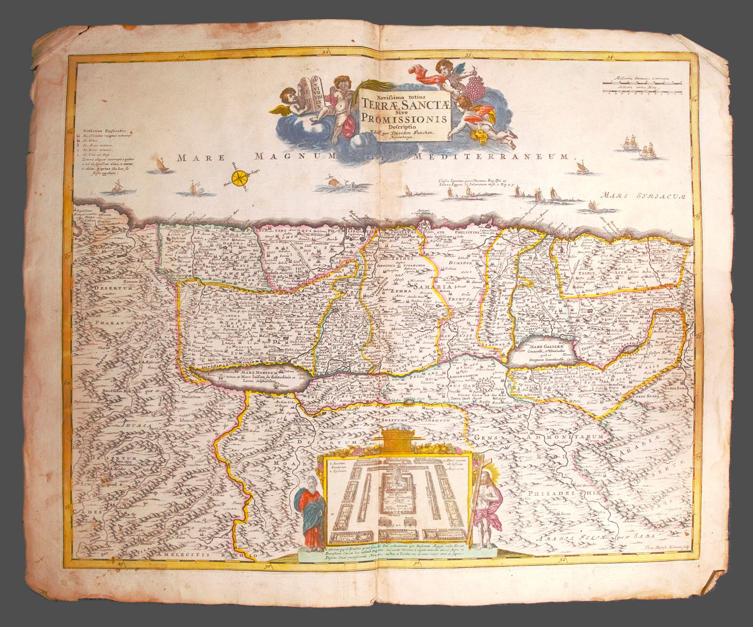 Hübsche, "gewestete" Gesamtkarte des Heiligen Landes mit großer figürlicher Kartuschen oben und unten einer Vogelschauansicht der Stadt Jerusalem, flankiert von Moses und Christus. – Mit Mittelfalz, papierbedingt gebräunt, braun-, finger- und feuchtfleckig, mit Randläsuren und knickspurig. Dekorativ.