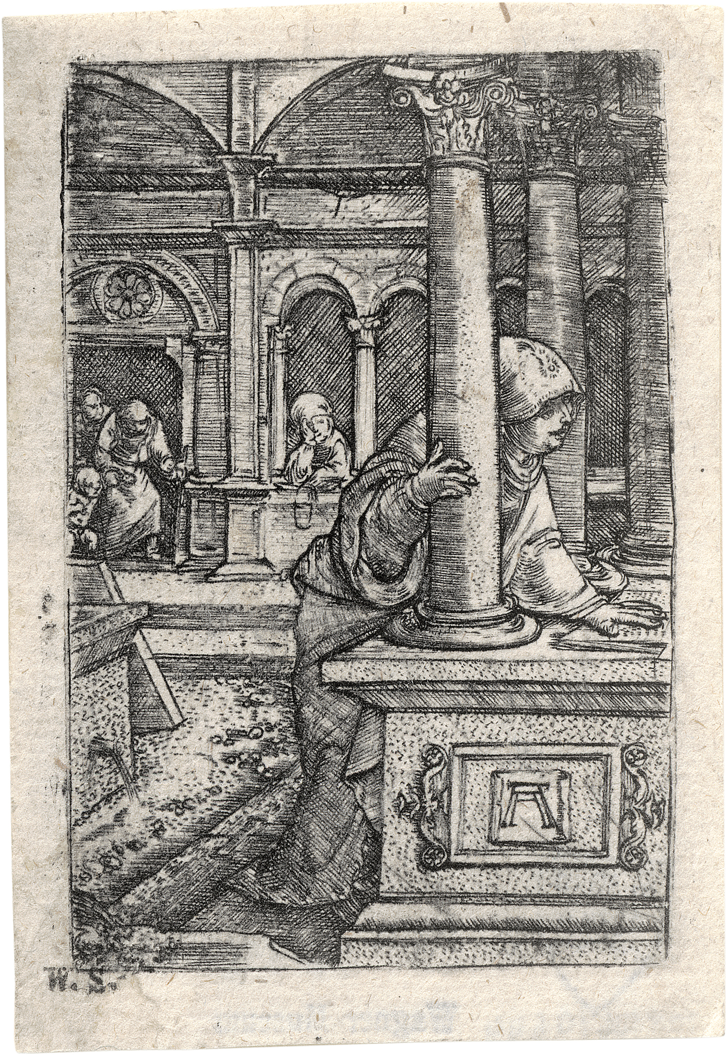 Maria sucht den zwölfjährigen Jesus im Tempel. Kupferstich. 6,1 x 4 cm. B. 24, Winzinger139, Mielke (New Hollstein) e.6.